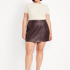 High-Waisted Faux-Leather Mini Skirt: wrap front, left side zipper, darted back, plaid print, #804477