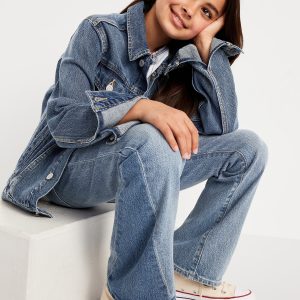 High-Waisted Flare-Leg Jeans for Girls: The it fits she really, really wants.interior adjustable waistband, sizes 5-8 snap-button closure, sizes 10-20 regular button closure, zip fly, utility pockets at front, patch pockets at back, flared leg, #855058