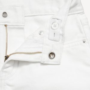 High-Waisted Frayed-Hem Jean Shorts for Girls: interior adjustable waistband, sizes 5-8 snap-button closure, sizes 10-20 regular button closure, zip fly, scoop pockets and coin pocket in front, patch pockets in back, rips/tears at front for a lived-in look, frayed hem, #855327