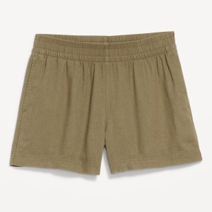 High-Waisted Linen-Blend Shorts — 3.5-inch inseam: comfort elastic waistband, on-seam hip pockets, back patch pockets, easy pull-on style, #693453