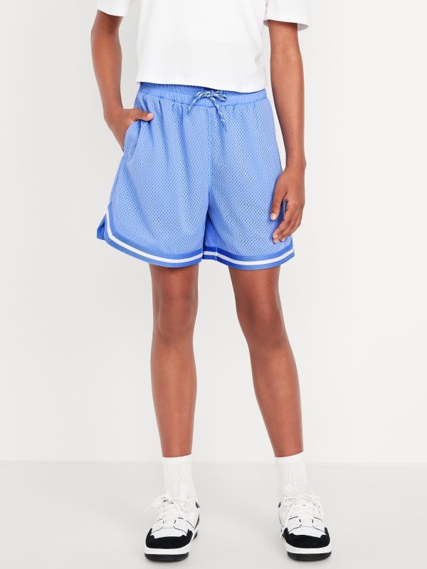 High-Waisted Mesh Basketball Shorts for Girls: high rise, elasticized waistband, adjustable drawstring, on-seam side pockets, retro striped tape trim at leg openings, vented sides, #696474