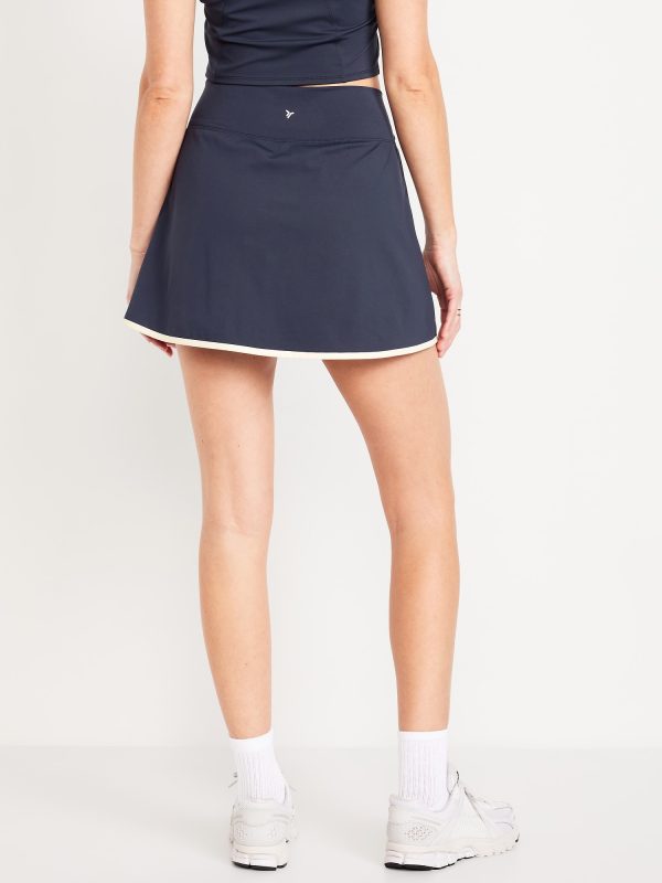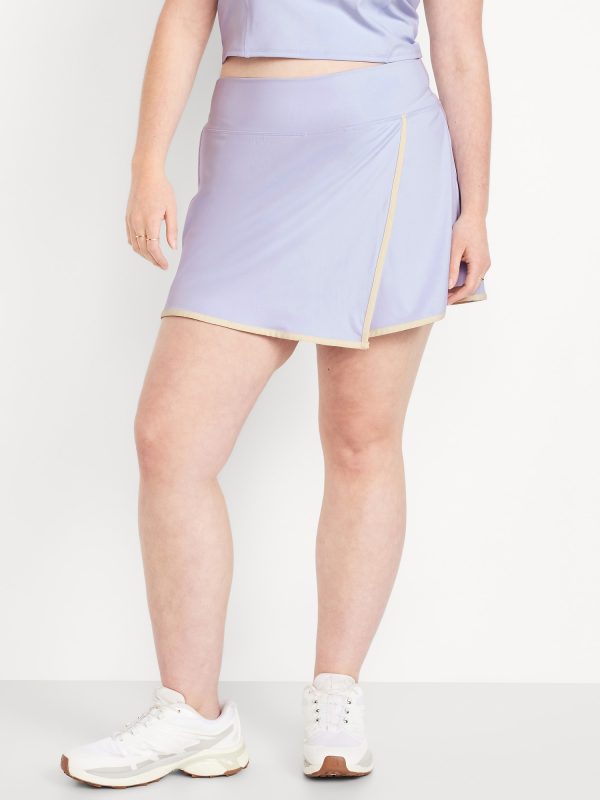 High-Waisted PowerSoft Faux-Wrap Skort: Featuring PowerSoft. Light compression meets a peachy-smooth, sweat-wicking fabric.pull-on waistband, faux-wrap front, built-in bike shorts, mini length, go-dry wicks moisture, breathable, #694169