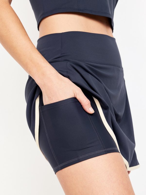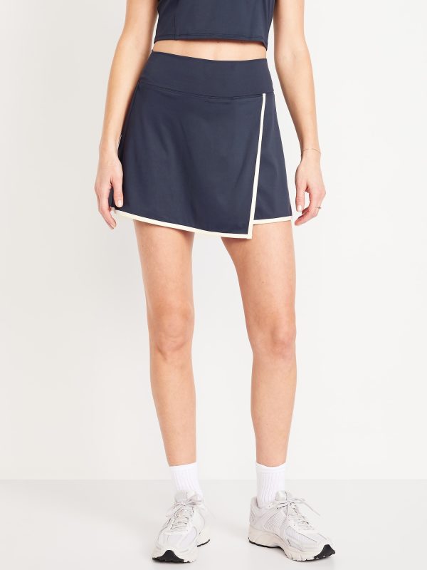 High-Waisted PowerSoft Faux-Wrap Skort: Featuring PowerSoft. Light compression meets a peachy-smooth, sweat-wicking fabric.pull-on waistband, faux-wrap front, built-in bike shorts, mini length, go-dry wicks moisture, breathable, #694169