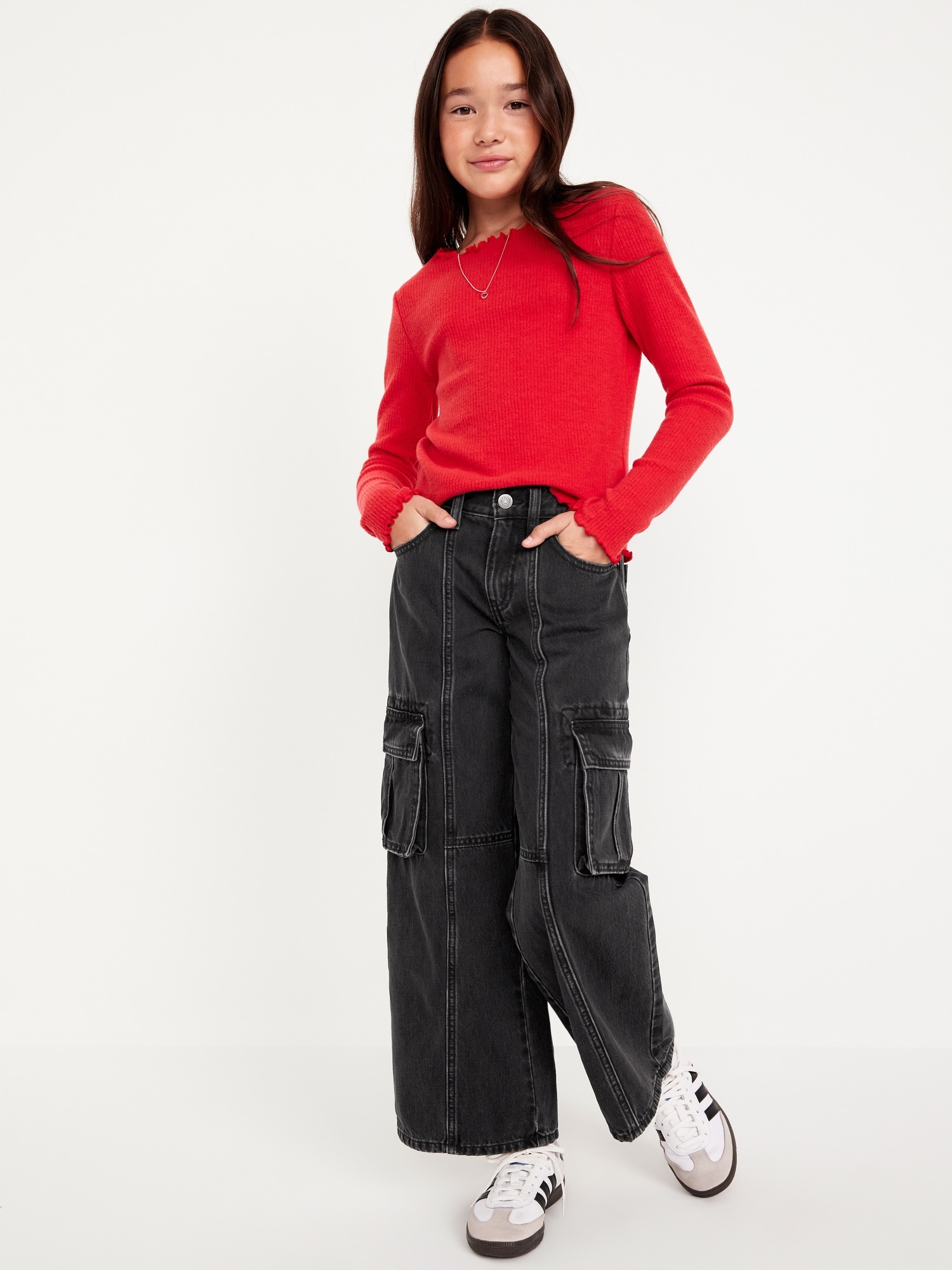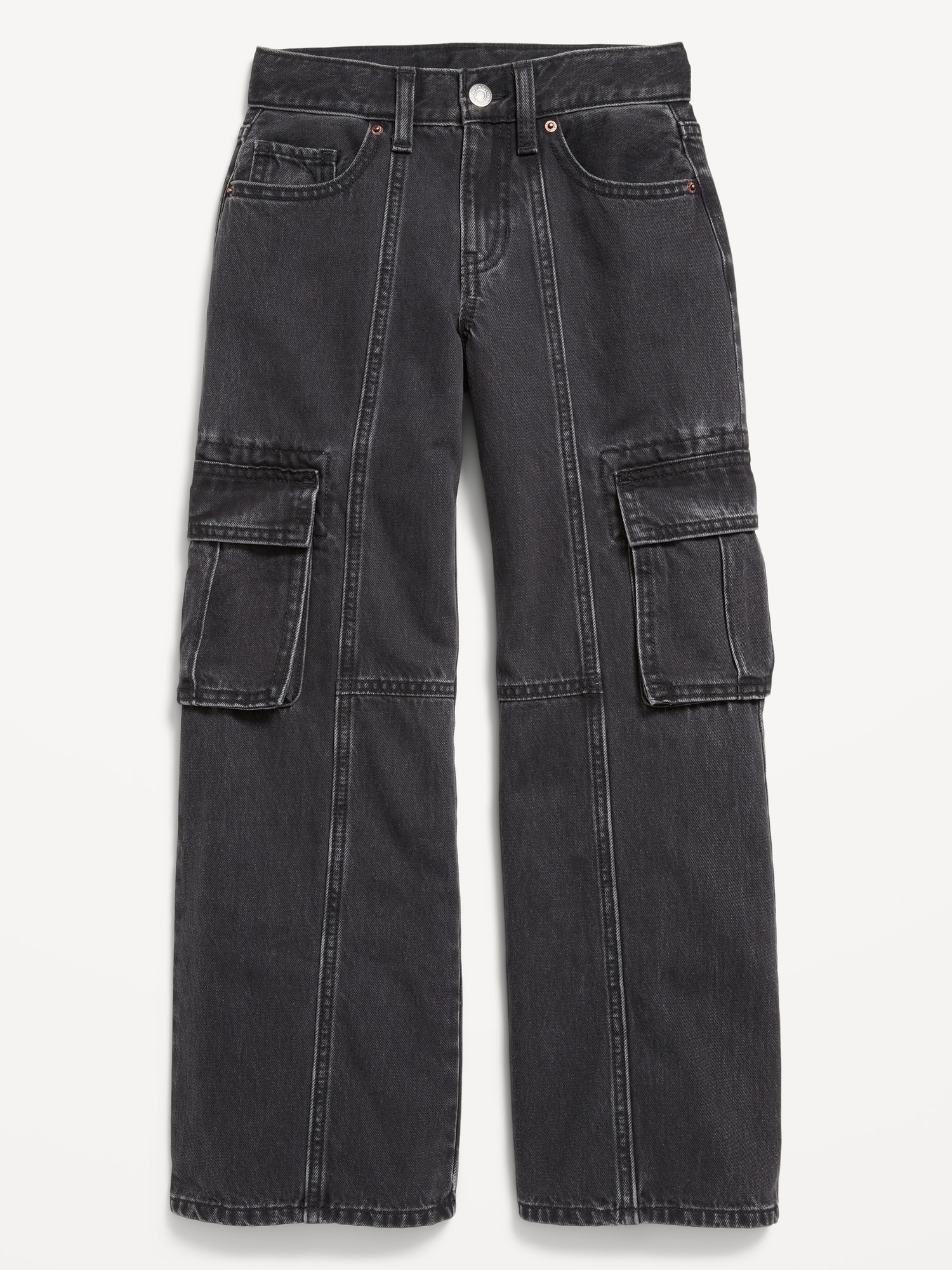 High-Waisted Super Baggy Wide-Leg Cargo Jeans for Girls: interior adjustable waistband, snap button closure (sizes 5-8), regular button closure (sizes 10-20), zip fly, scoop pockets and coin pocket, patch pockets at back, flap-cargo pockets, super wide leg opening, #583291