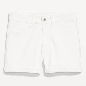 High-Waisted Wow Jean Shorts — 3-inch inseam: button front, belt loops, zip fly, front scoop pockets, back patch pockets, cuffed hem, #890124