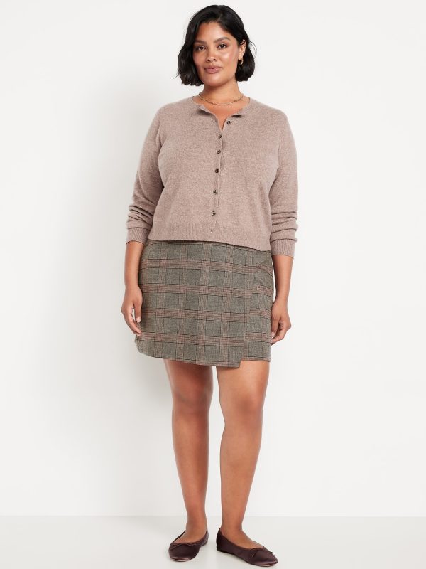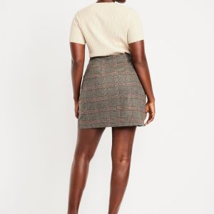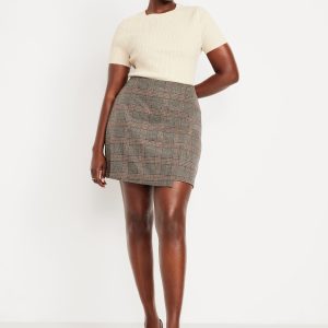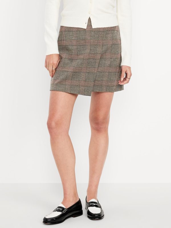High-Waisted Wrap-Front Mini Skirt: wrap front, left side zipper, darted back, plaid print, #804477