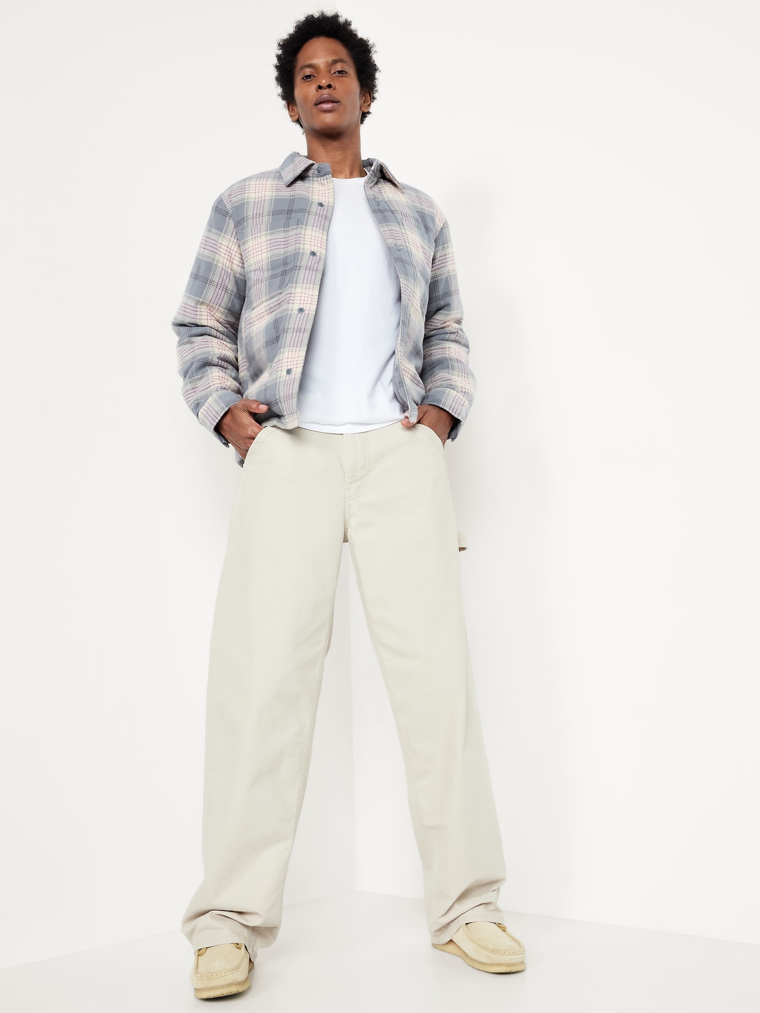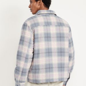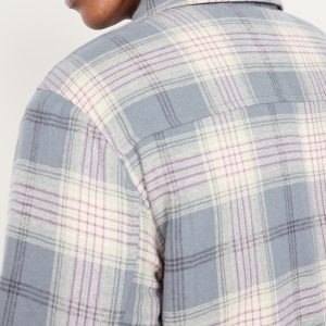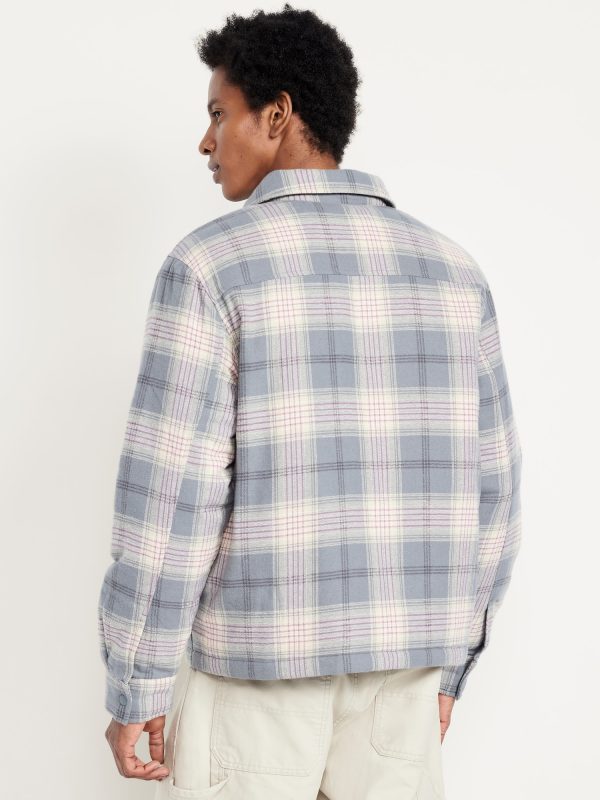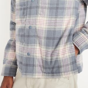 Insulated Cropped Flannel Shacket: spread collar, long sleeves with snap cuffs, full-snap front, patch chest pockets, plaid print, #800296
