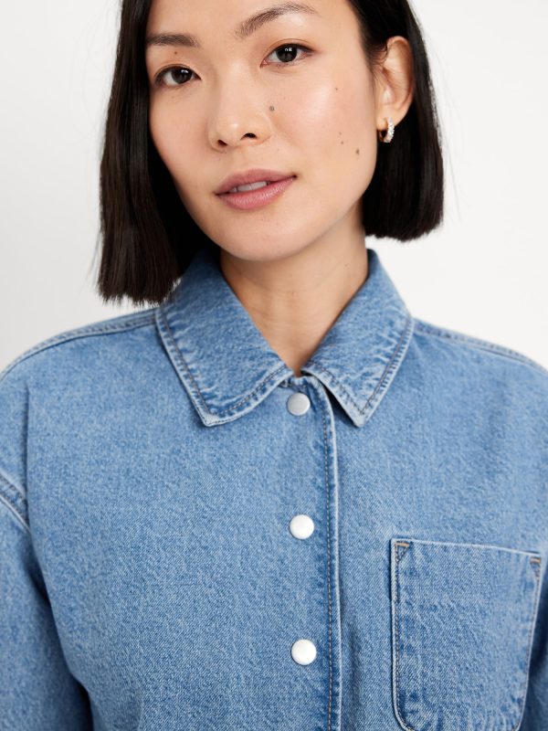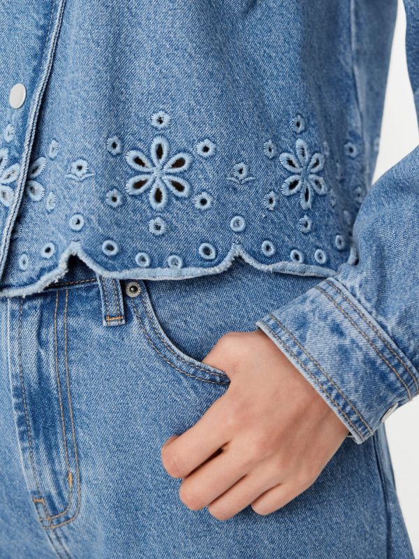 Jean Eyelet Jacket: spread collar, long sleeves with snap cuffs, full-snap front, patch chest pocket, embroidered eyelet trim, scalloped hem, #693759