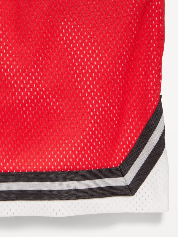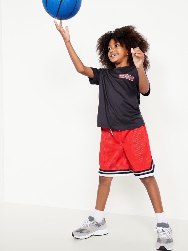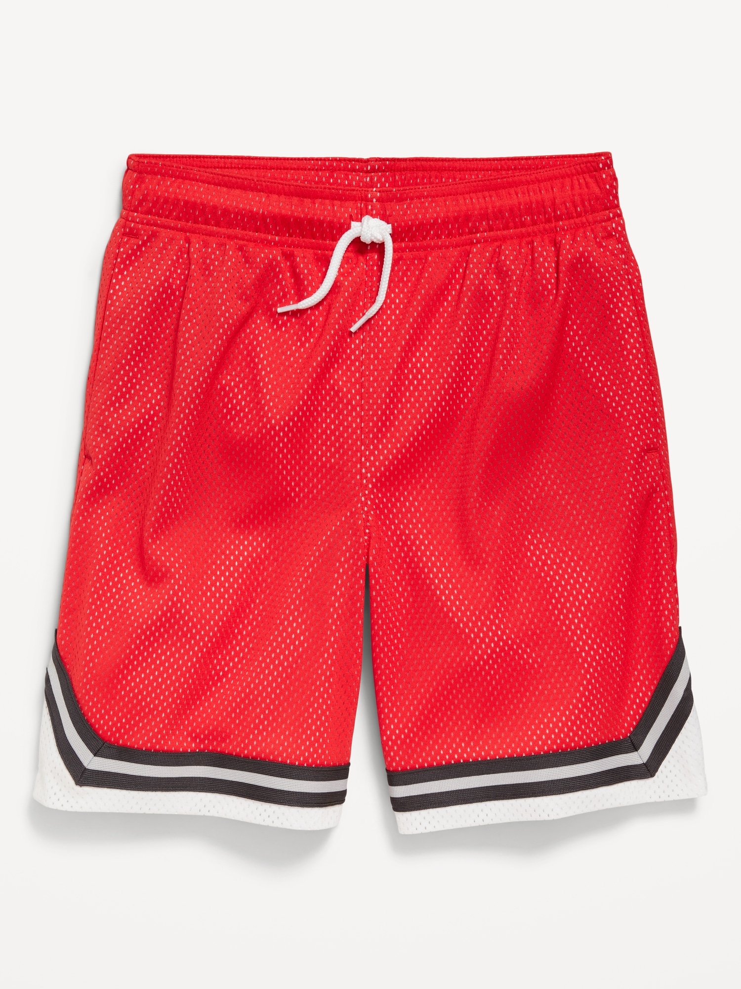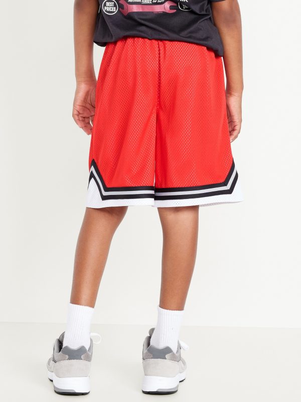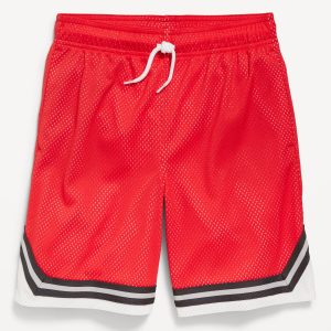 Knee Length Mesh Basketball Shorts for Boys: Made to keep up with all their shenanigans., Elasticized waistband, with adjustable drawstring., On-seam welt pockets., Retro striped tape trim at leg openings and vented sides., Breathable lightweight mesh lets him vent., Smooth, lightweight tricot lining., #875637