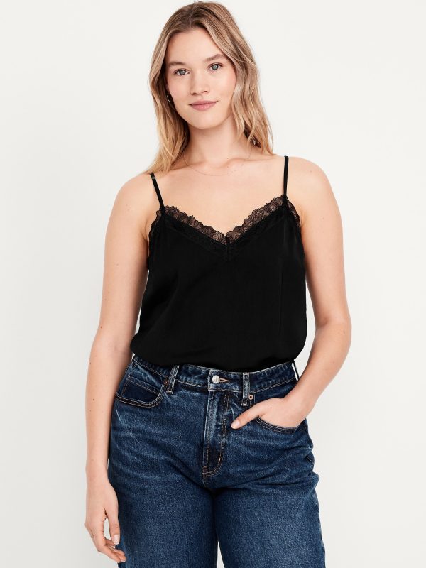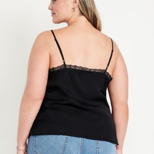 Lace-Trim Satin Cami Top: lace-trim v-neck, adjustable spaghetti straps, darted bust, #798427