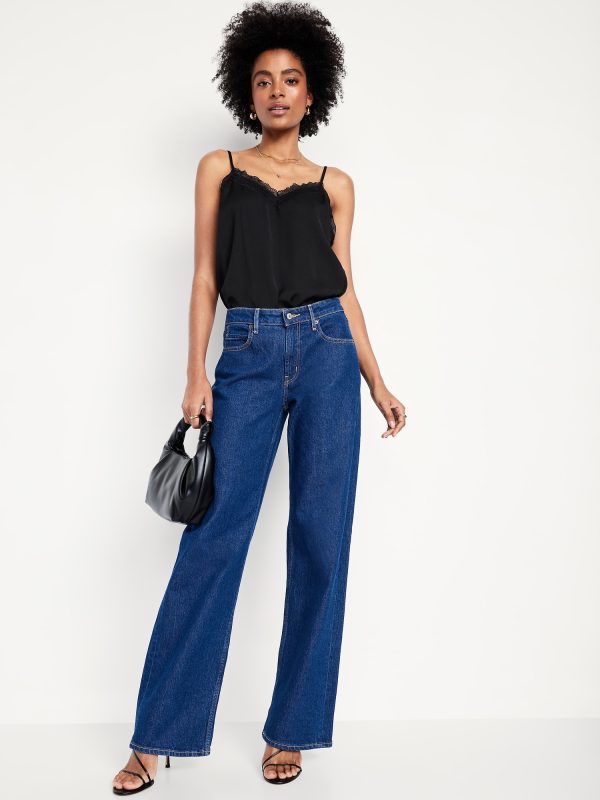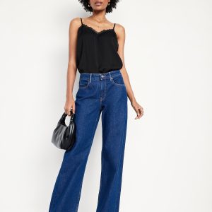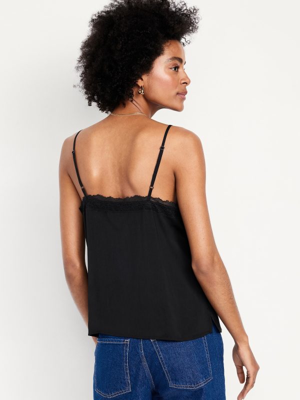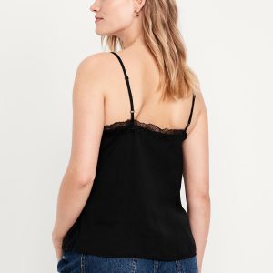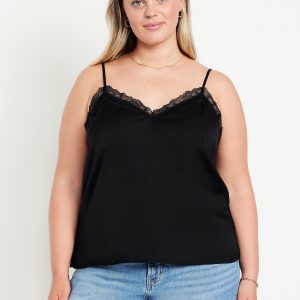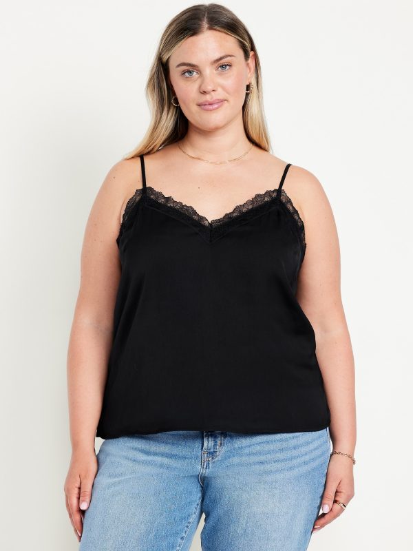 Lace-Trim Satin Cami Top: lace-trim v-neck, adjustable spaghetti straps, darted bust, #798427