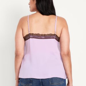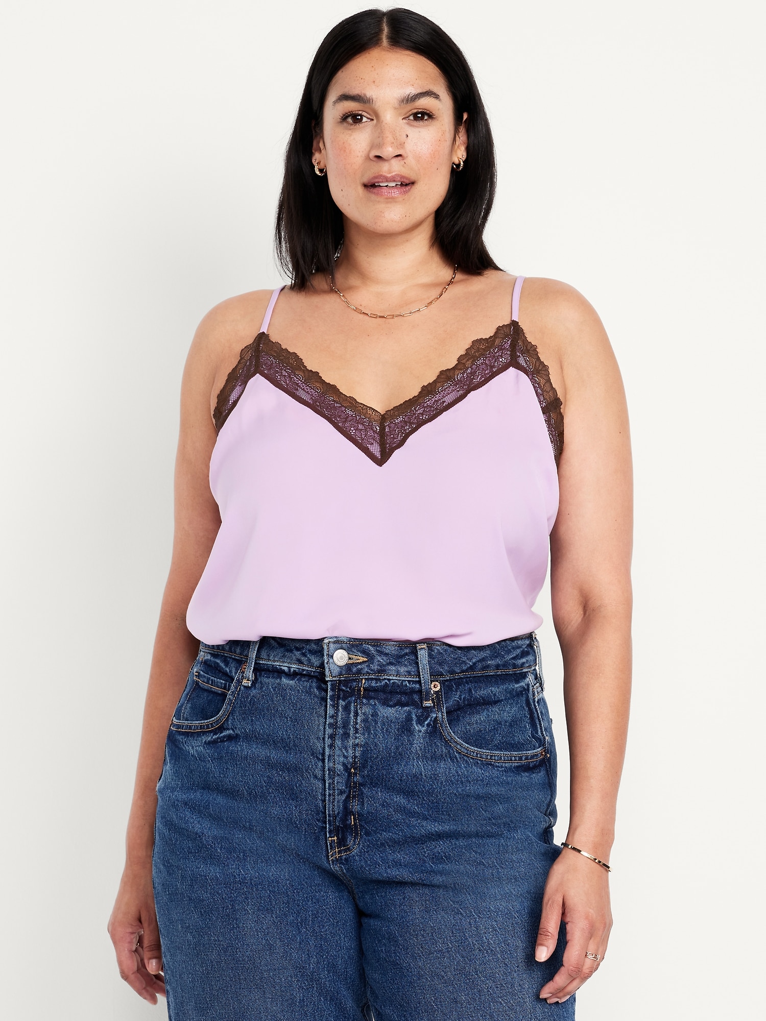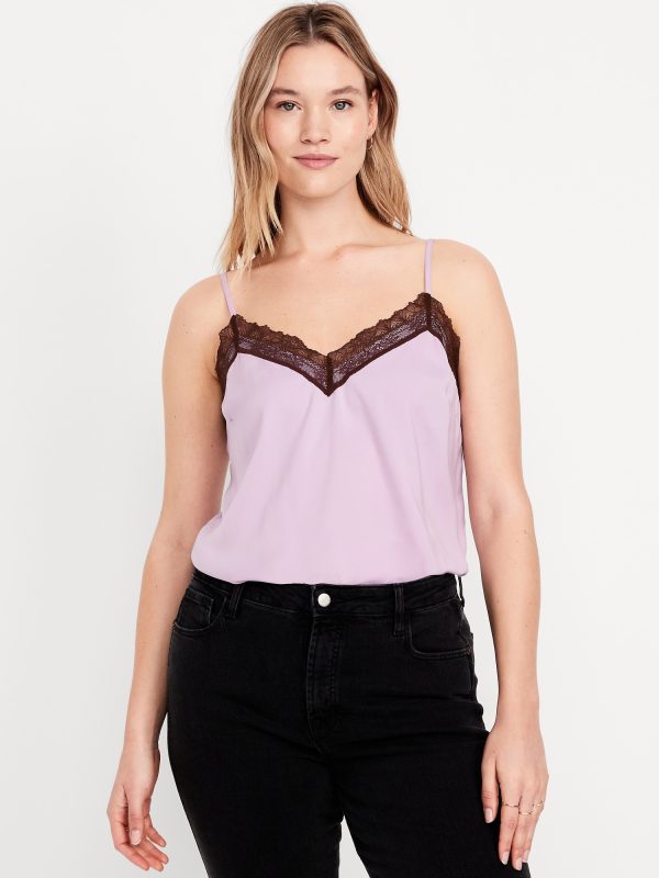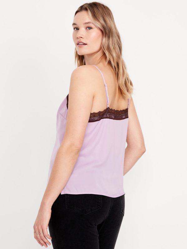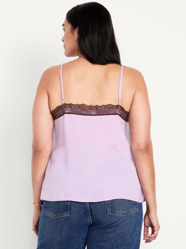 Lace-Trim Satin Cami Top: lace-trim v-neck, adjustable spaghetti straps, darted bust, #798427