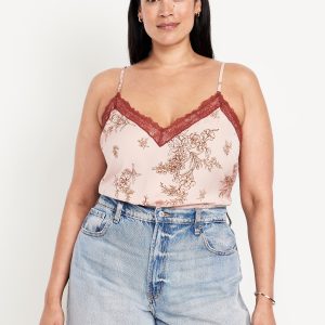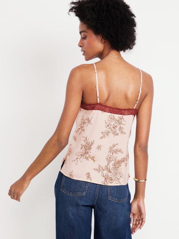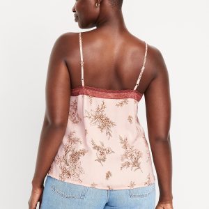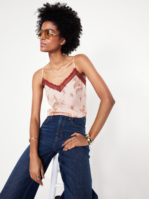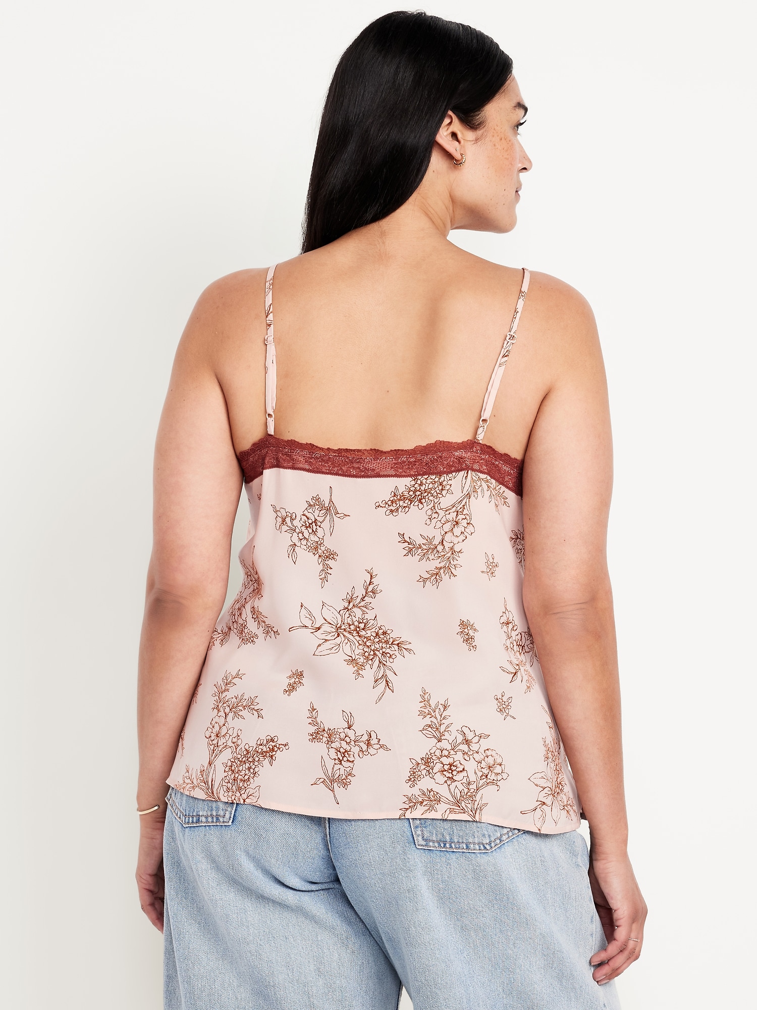 Lace-Trim Satin Cami Top: lace-trim v-neck, adjustable spaghetti straps, darted bust, #798427