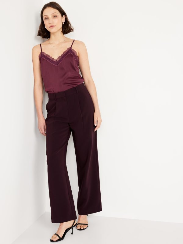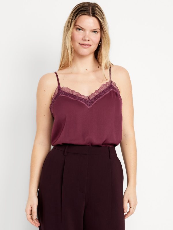 Lace-Trim Satin Cami Top: lace-trim v-neck, adjustable spaghetti straps, darted bust, #798427