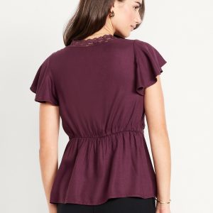 Lace-Trim V-Neck Crepe Top: lace-trim v-neck and bodice, short flutter sleeves, elastic back waist, shirred detail, #798558