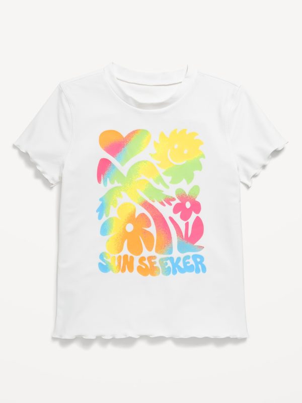 Lettuce-Edge Graphic Rashguard Swim Top for Girls: crew neck, short sleeves, lettuce edge cuffs and hem, graphic at front, #691741