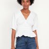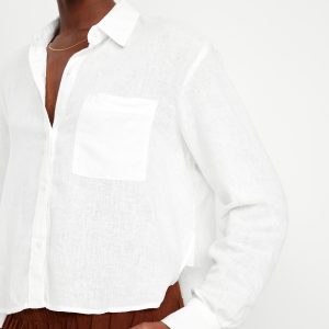 Linen-Blend Button-Down Crop Shirt: spread collar, long sleeves, buttoned cuffs, full-button front, patch chest pocket, #760758