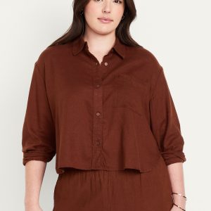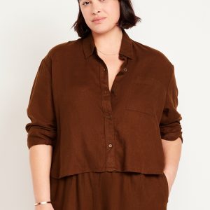 Linen-Blend Button-Down Crop Shirt: spread collar, long sleeves, buttoned cuffs, full-button front, patch chest pocket, #760758