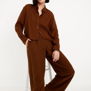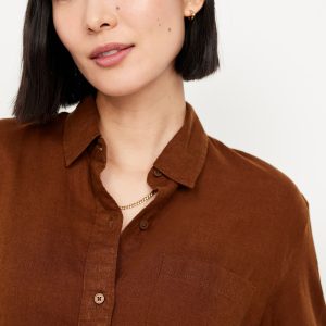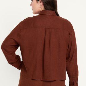 Linen-Blend Button-Down Crop Shirt: spread collar, long sleeves, buttoned cuffs, full-button front, patch chest pocket, #760758