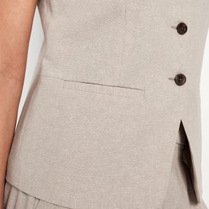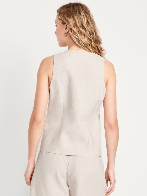 Linen-Blend Button-Front Vest: high crew neck, button front, welt pockets, princess seams, #693733