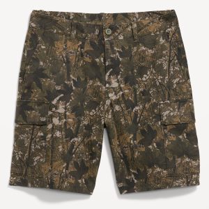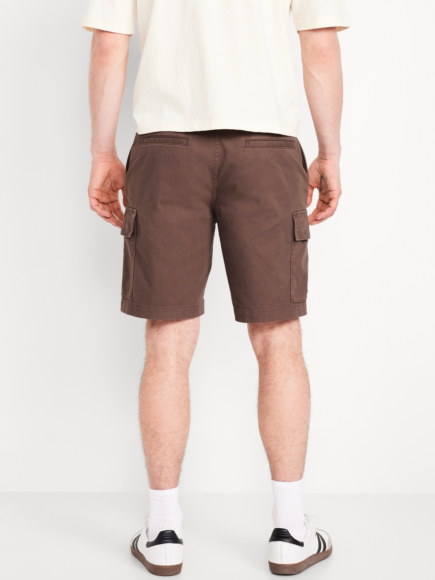 Lived-In Cargo Shorts — 9-inch inseam: button front, belt loops, zip fly, diagonal front pockets, back welt pockets, flap-cargo pockets at thigh, #695513