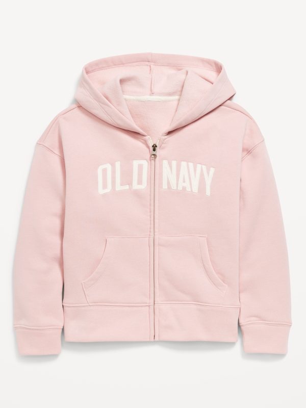 Logo-Graphic Zip Hoodie for Girls: built-in hood, long sleeves, full-length front zipper, embroidered logo graphic, banded hem, #871012