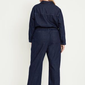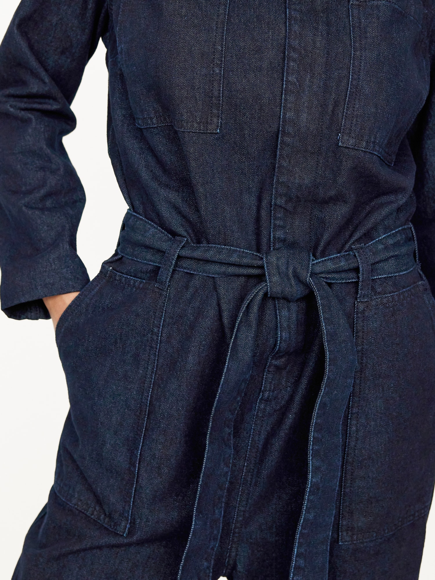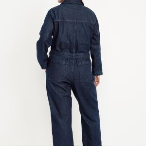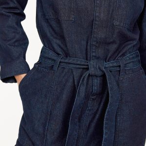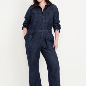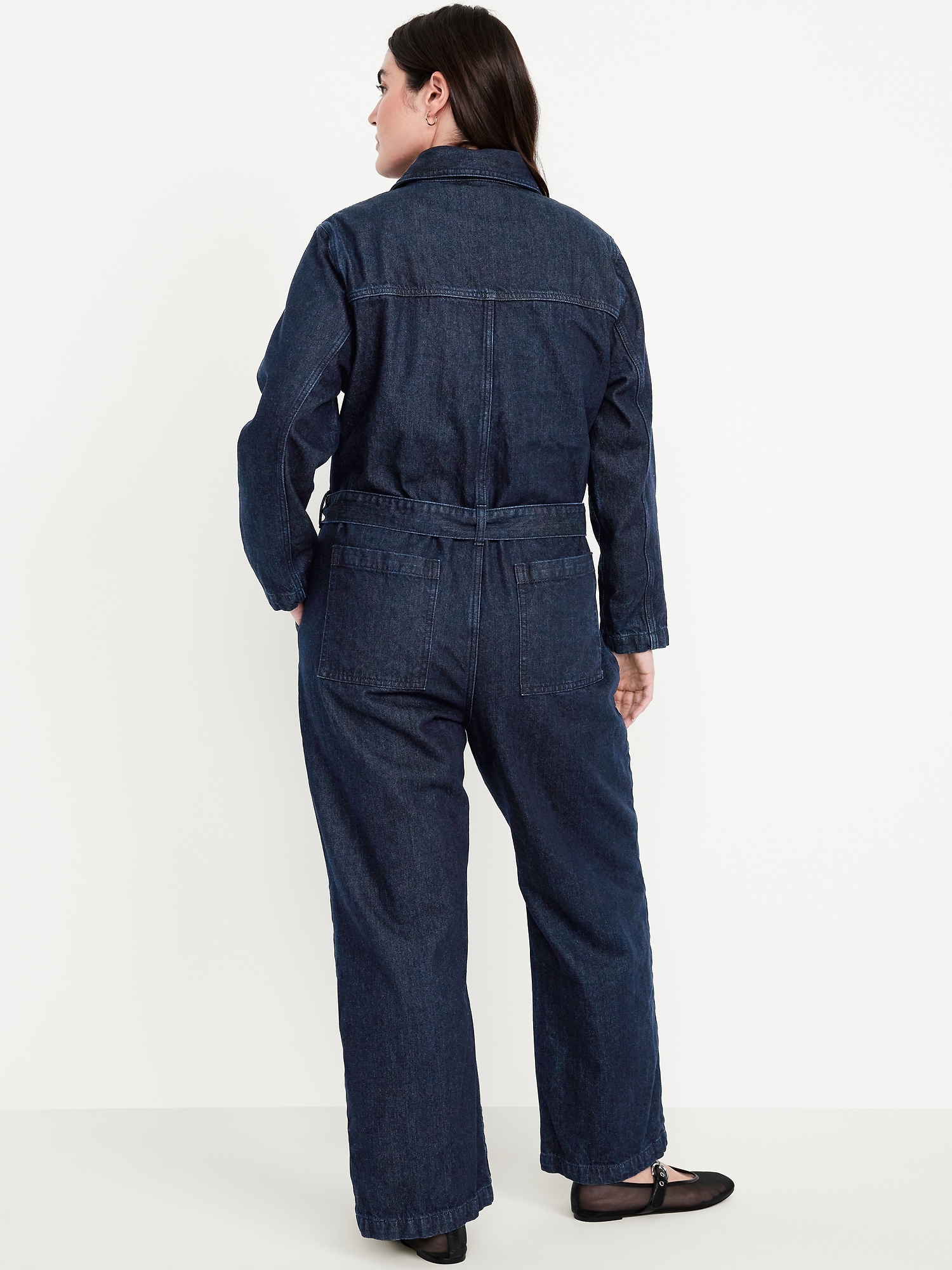 Long-Sleeve Denim Jumpsuit: spread collar, long sleeves, tie-belt waist, covered zipper, chest pockets, front pockets, back patch pockets, #804428
