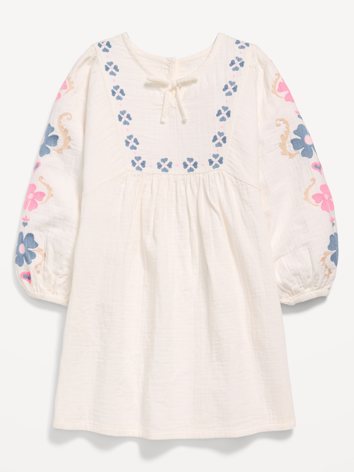 Long-Sleeve Double-Weave Embroidered Swing Dress for Girls