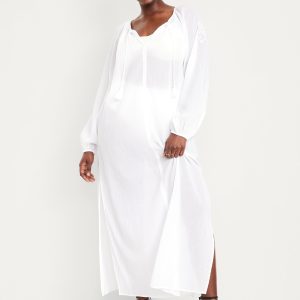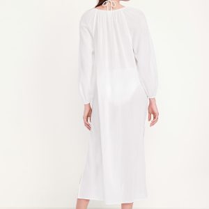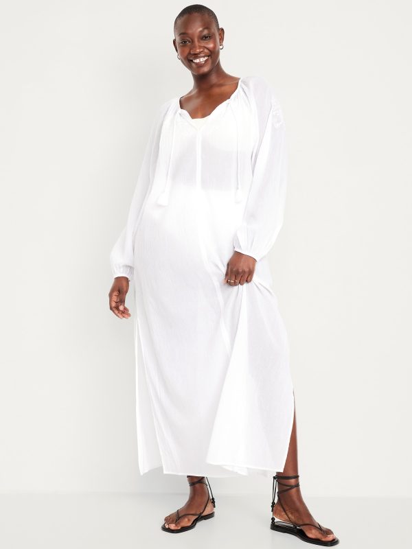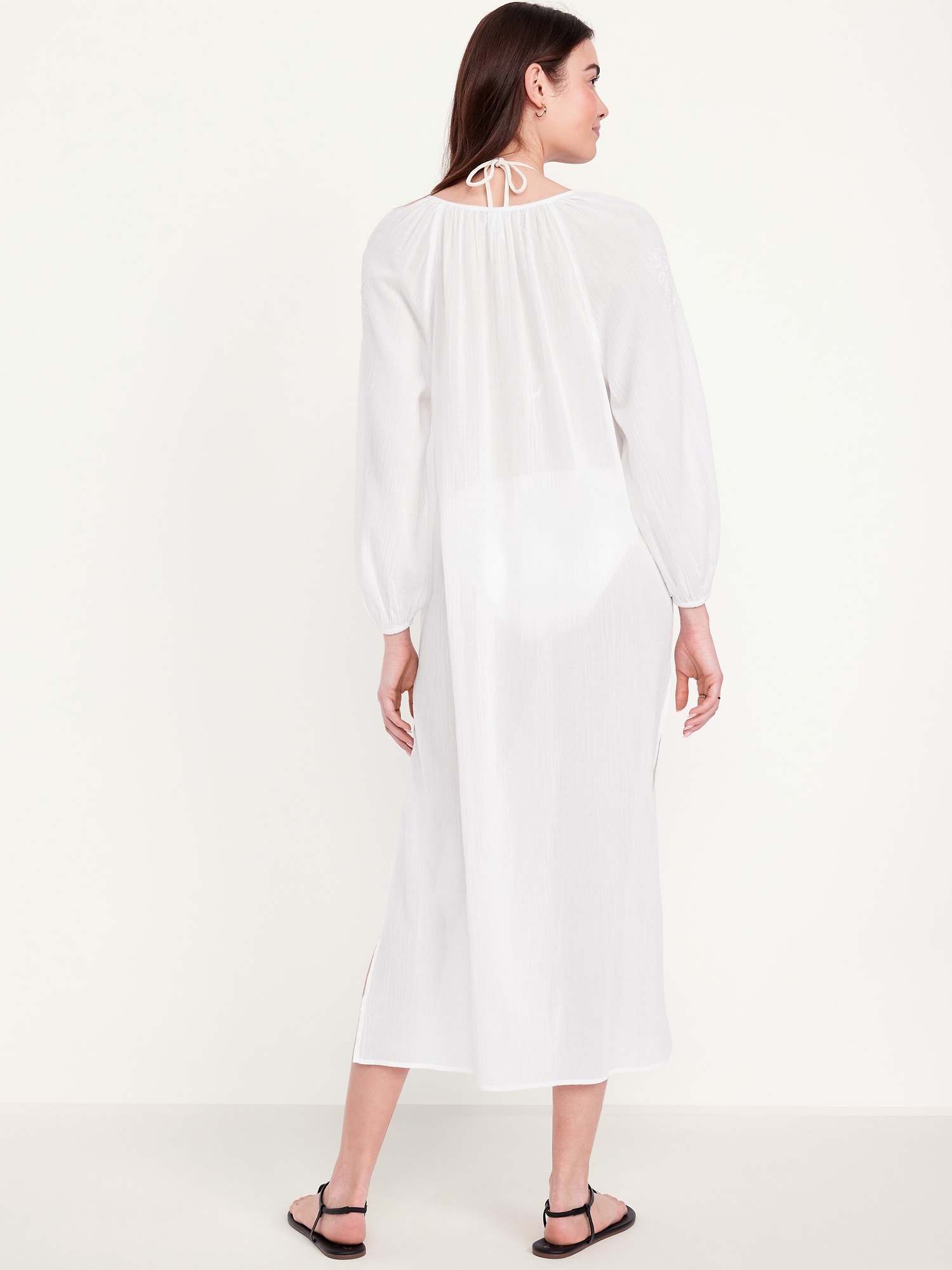 Long-Sleeve Gauze Kaftan: split tassel-front neck, long sleeves, elastic cuffs, split seams, #766932