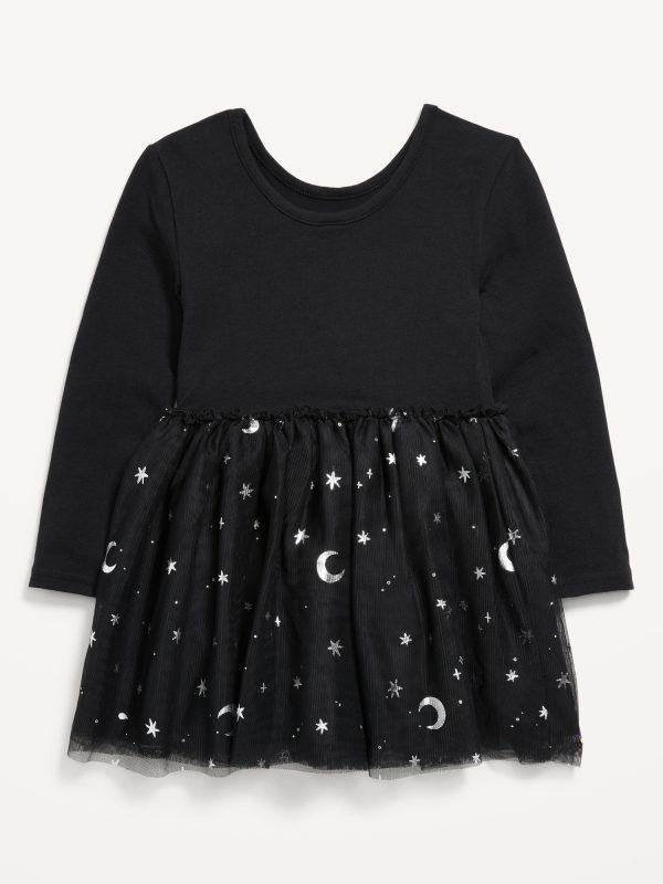 Long-Sleeve Halloween Tutu Dress for Toddler Girls: scoop neck, long sleeves, deep scoop back, graphic at front, seamed ruffled waist, flared tutu skirt, lightweight tulle mesh layers, #801317