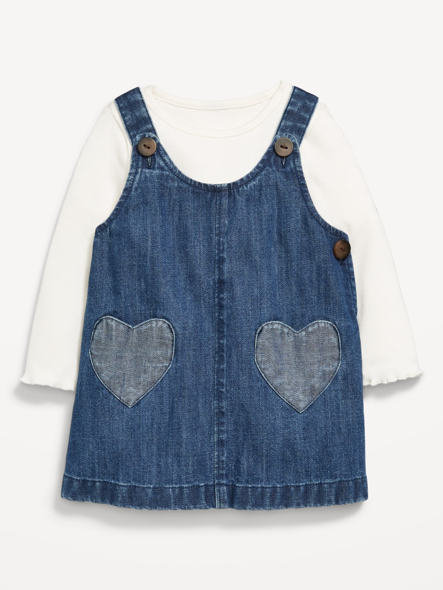 Long-Sleeve Ribbed T-Shirt and Chambray Dress Set for Baby: round neckline, long sleeves, coordinating dress, buttoned shoulder straps, side buttoned closure, heart patch pockets, #802742