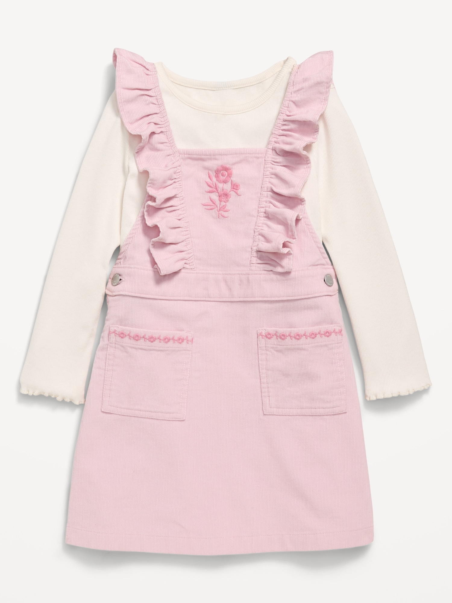 Long-Sleeve T-Shirt and Corduroy Dress Set for Toddler Girls: square neckline, wide shoulder straps cross at back, ruffle trim along front of straps, embroidered floral pattern at front, patch pockets at front with embroidered floral pattern, #805551