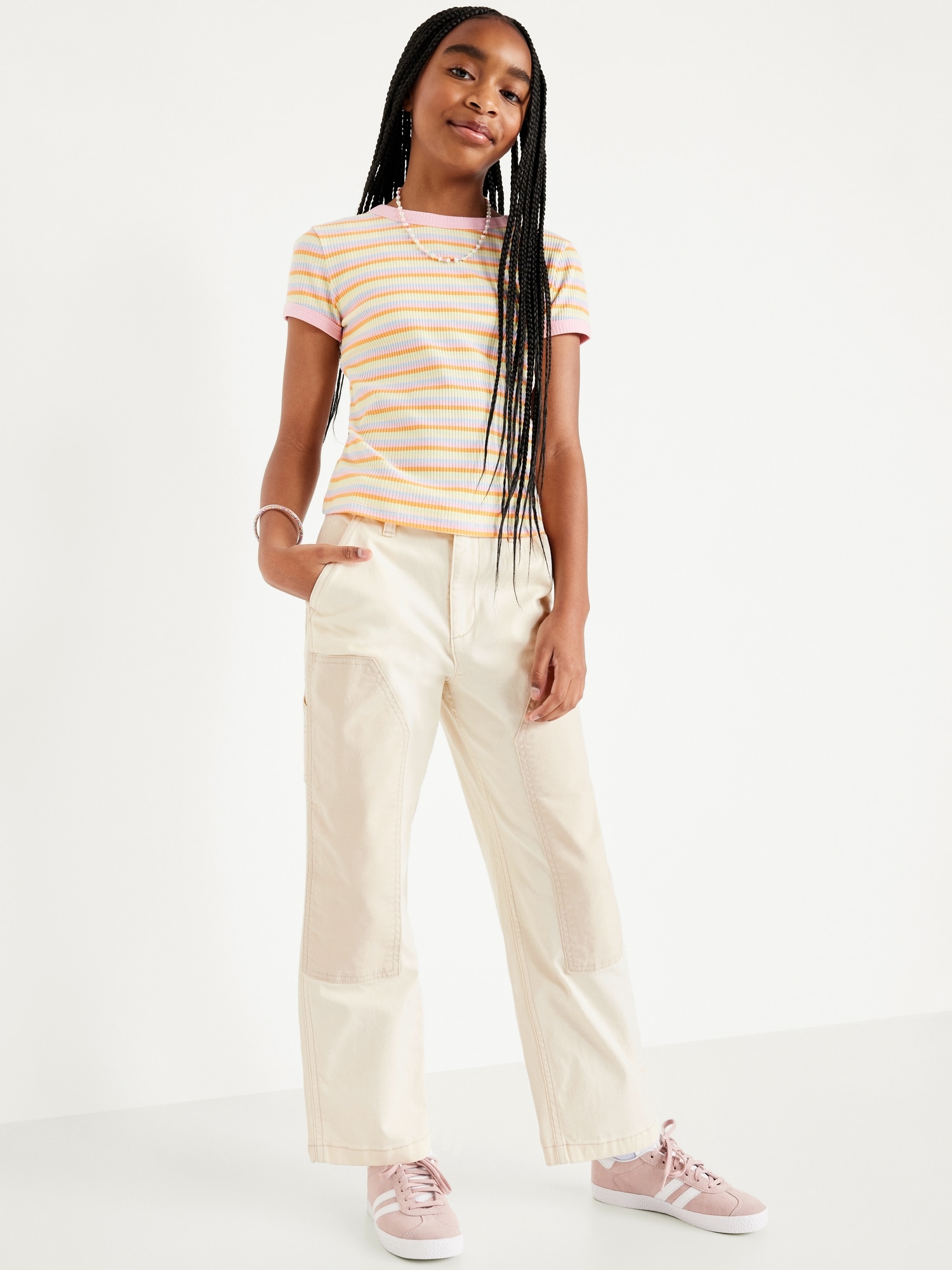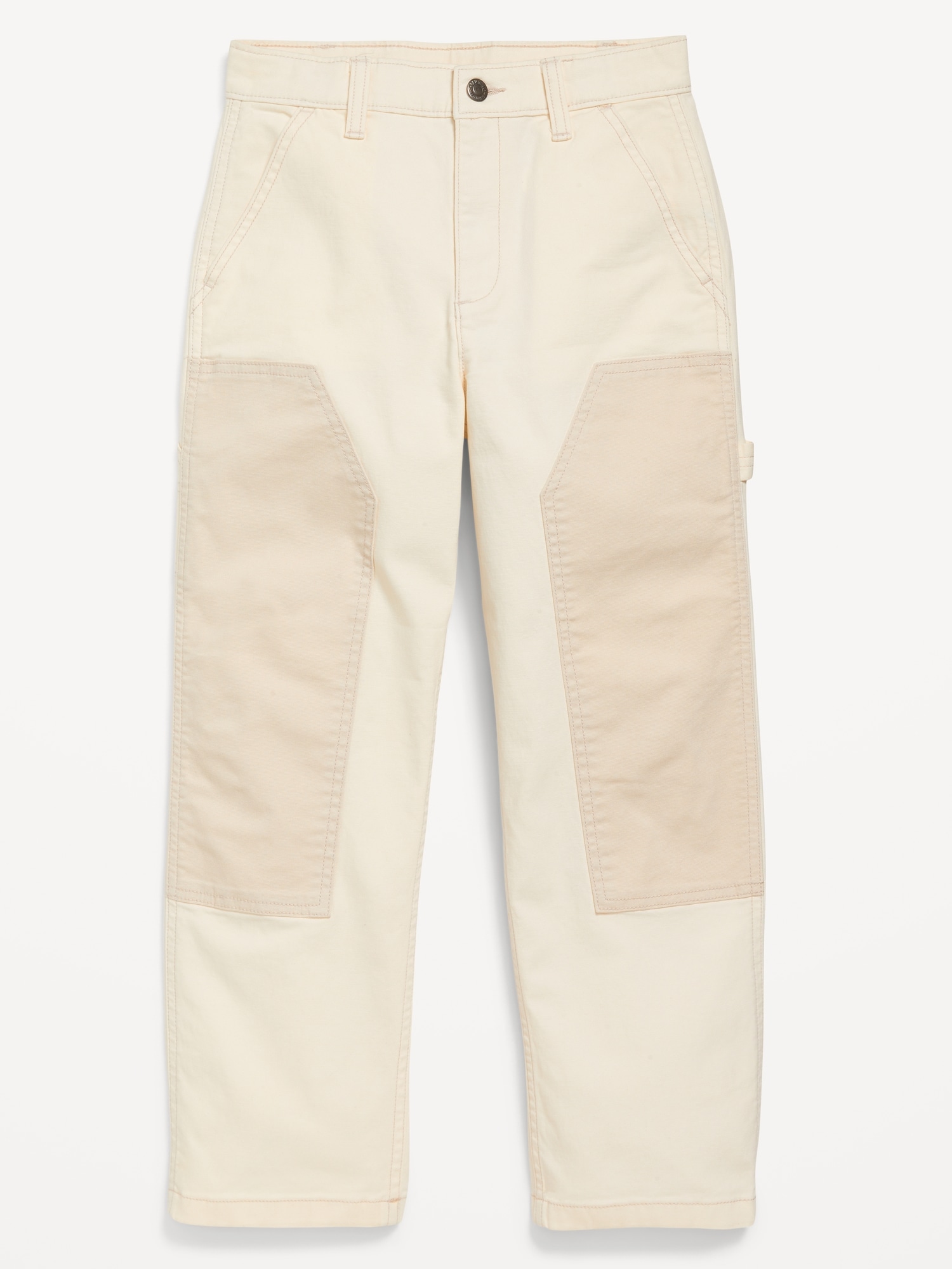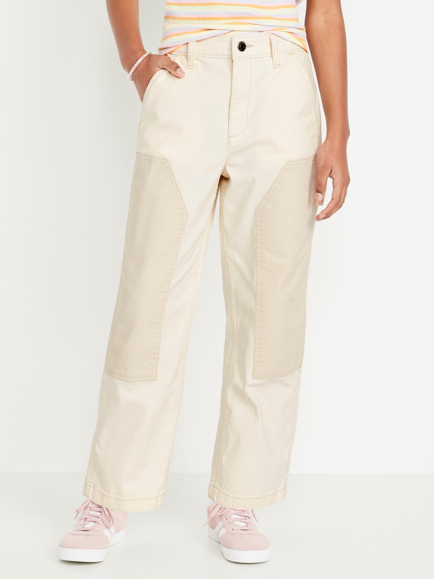 Loose High-Waisted Carpenter Pants for Girls: interior adjustable waistband, sizes 5-8 snap-button closure, sizes 10-20 regular button closure, zip fly, diagonal pockets, utility patch pockets at back, hammer loop at left leg, knee patches at front, #704707
