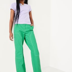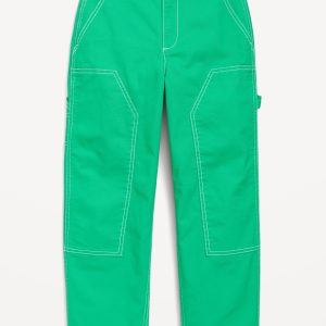 Loose High-Waisted Carpenter Pants for Girls: interior adjustable waistband, sizes 5-8 snap-button closure, sizes 10-20 regular button closure, zip fly, diagonal pockets, utility patch pockets at back, hammer loop at left leg, knee patches at front, #704707