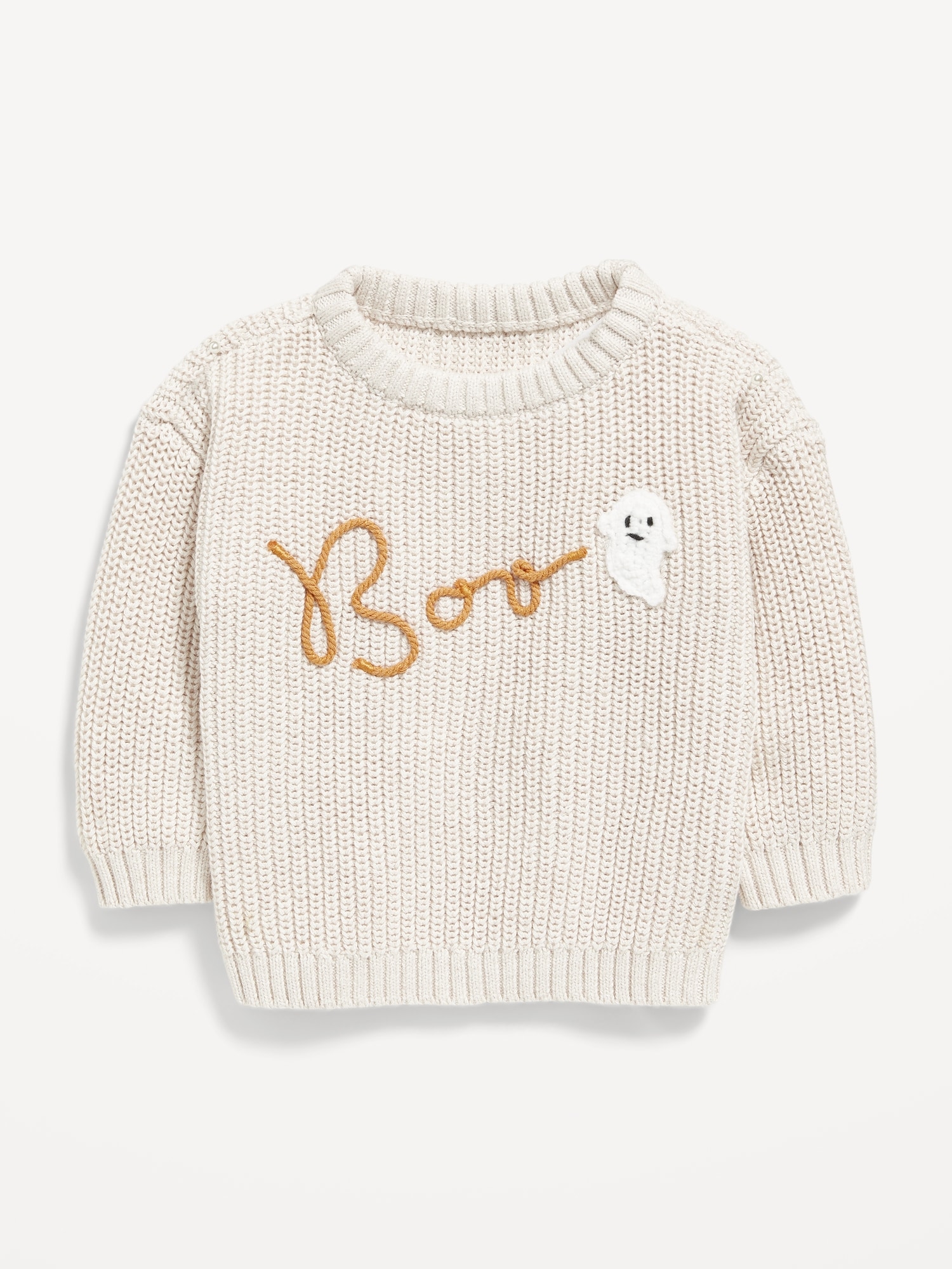 Loose Shaker-Stitch Sweater for Baby: ribbed crew neck, long sleeves, drop shoulders, embroidered lettering across front, ribbed cuffs and hem, #789179