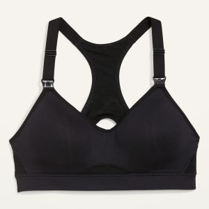 Maternity High Support Nursing Sports Bra: Wide adjustable shoulder straps, with detachable clips for convenient nursing access., Sweetheart neckline, with breathable mesh racerback., Built-in shaped cups., Banded elastic hem, with adjustable hook-and-eye strap at center back for easy wear & a personalized fit., Go-Dry moisture-wicking technology keeps you dry & comfortable., #687235