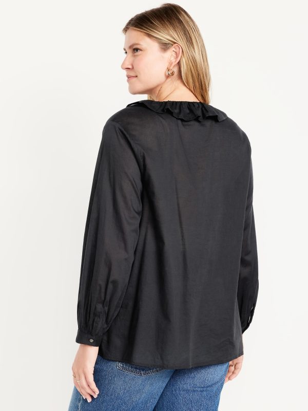 Maternity Long Sleeve Button-Down Ruffle Shirt: flat ruffle collar, button closure, cuffed sleeves, lace trim at collar, #826404