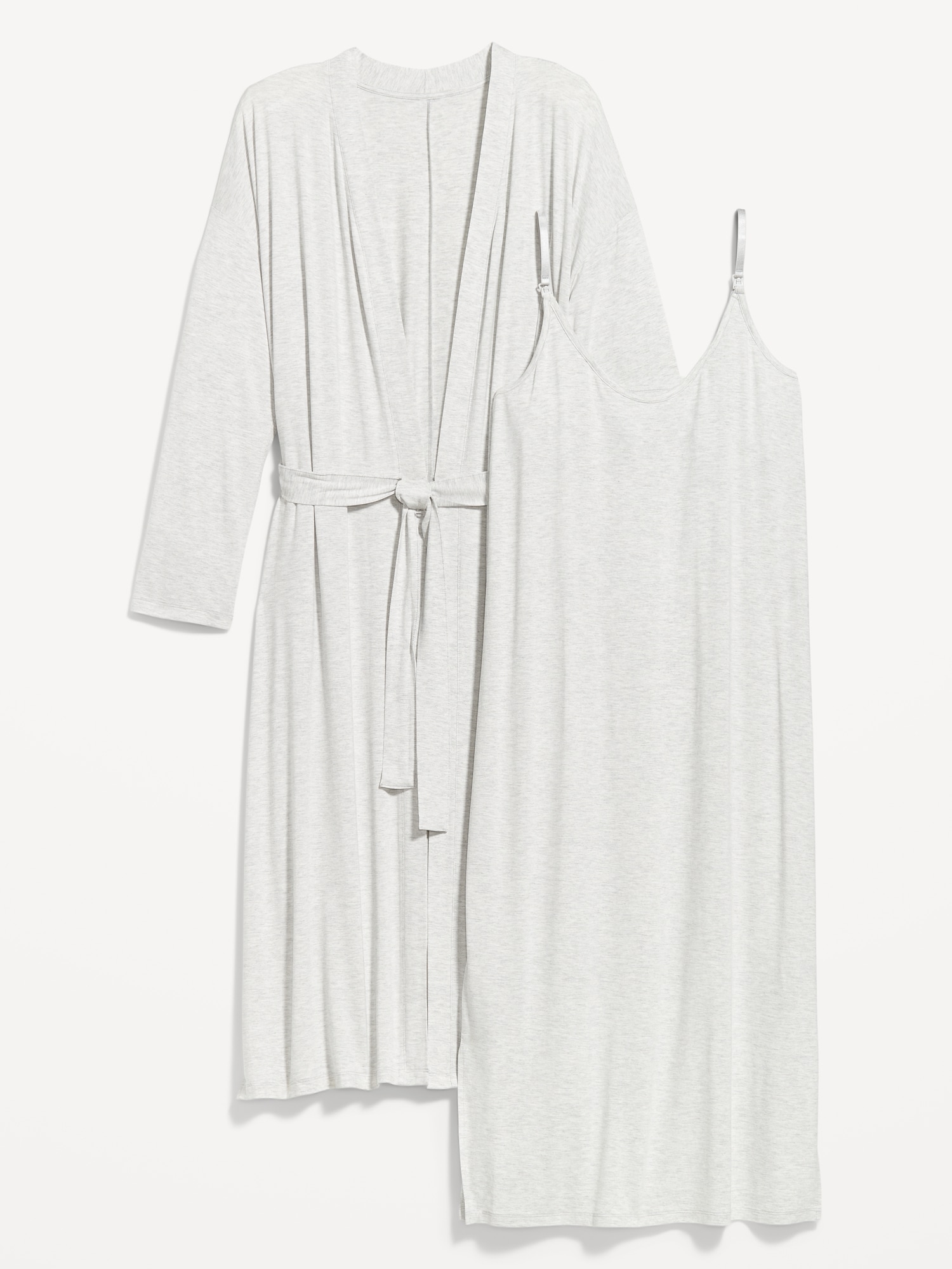 Maternity Robe and Nursing Nightgown Set: includes bathrobe and matching cami nightgown, robe has long sleeves, removeable tie belt and on-seam pockets, nightgown has detachable clips at spaghetti straps, built-in shelf bra for convenient nursing, #465767