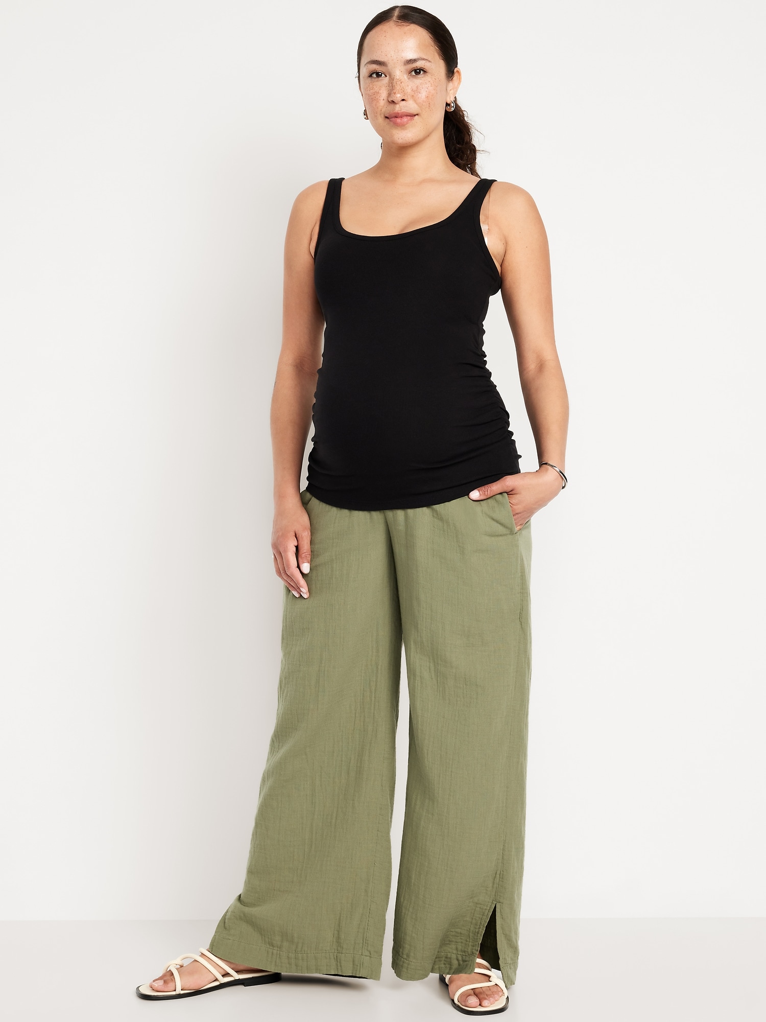 Maternity Rollover Waist Crinkle Gauze Wide-Leg Pants: A light, rippled fabric that’s begging to be beachside.rollover waist, pull-on style, on-seam hip pockets, wide leg, #771711