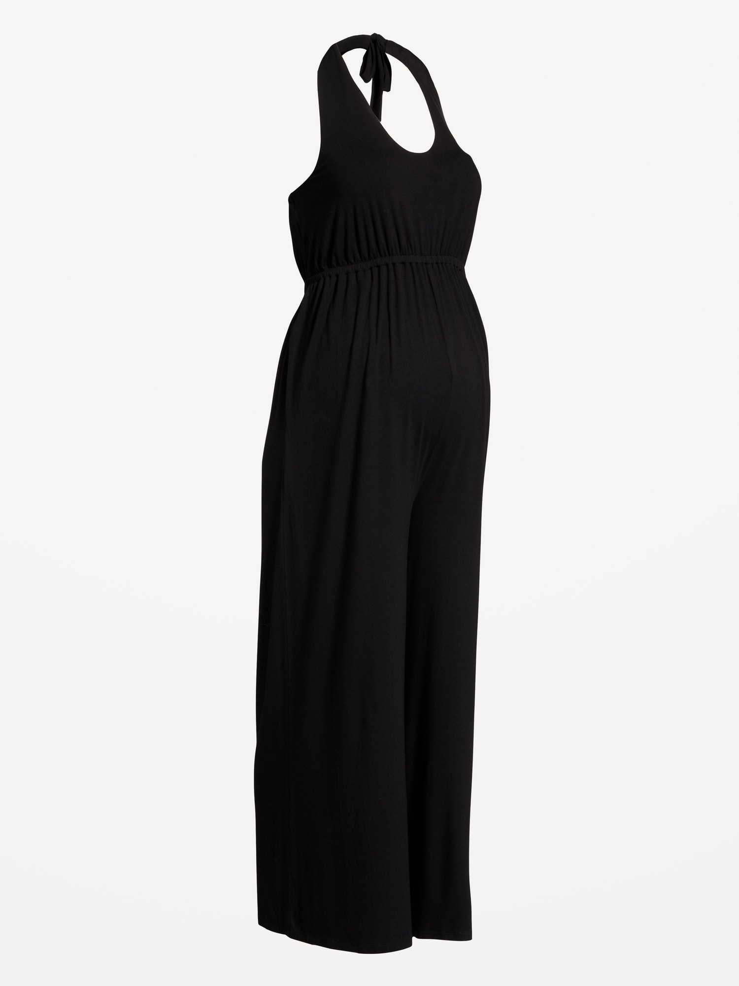 Maternity Waist-Defined Halter Jumpsuit: perfect for baby shower, tie-back halter neck, sleeveless, elastic waistband, on-seam pockets, wide leg, #719575