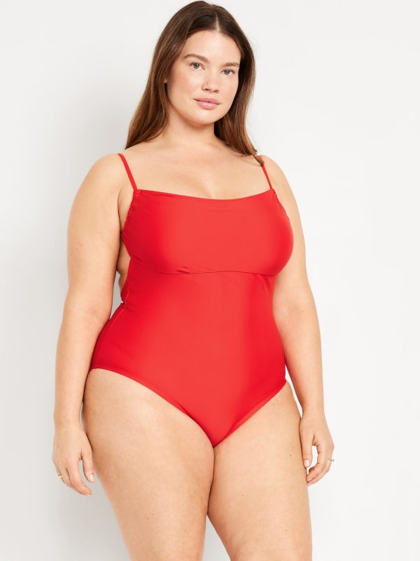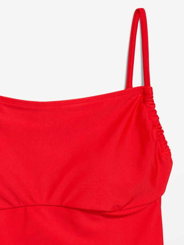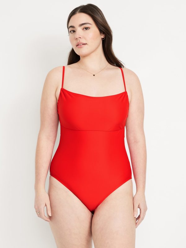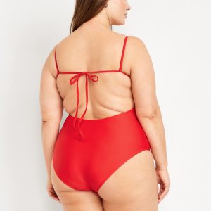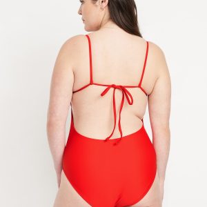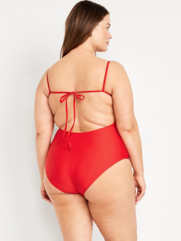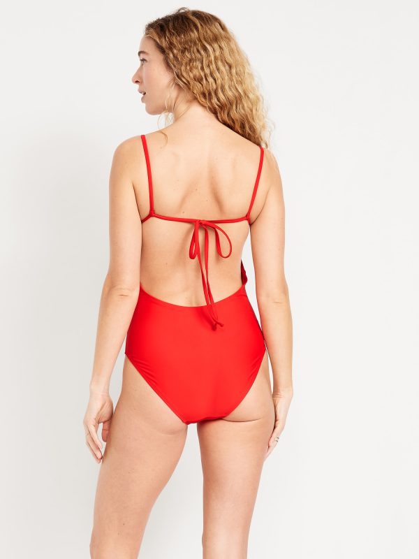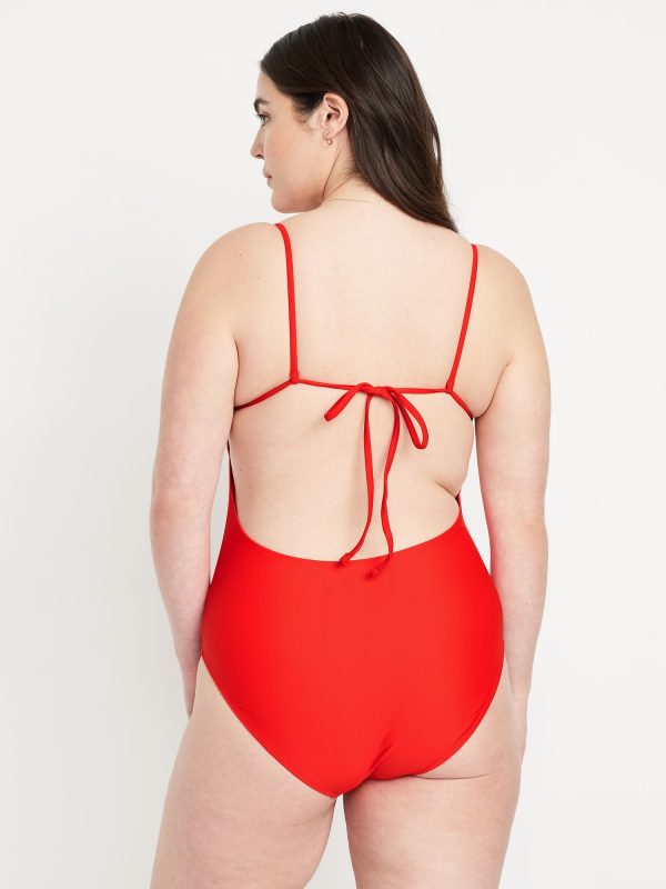 Matte Cutout Back One-Piece Swimsuit: spaghetti straps, ruched bodice, shelf bra, removable pads, cutout back, tie-back closure, elastic leg openings, #660611