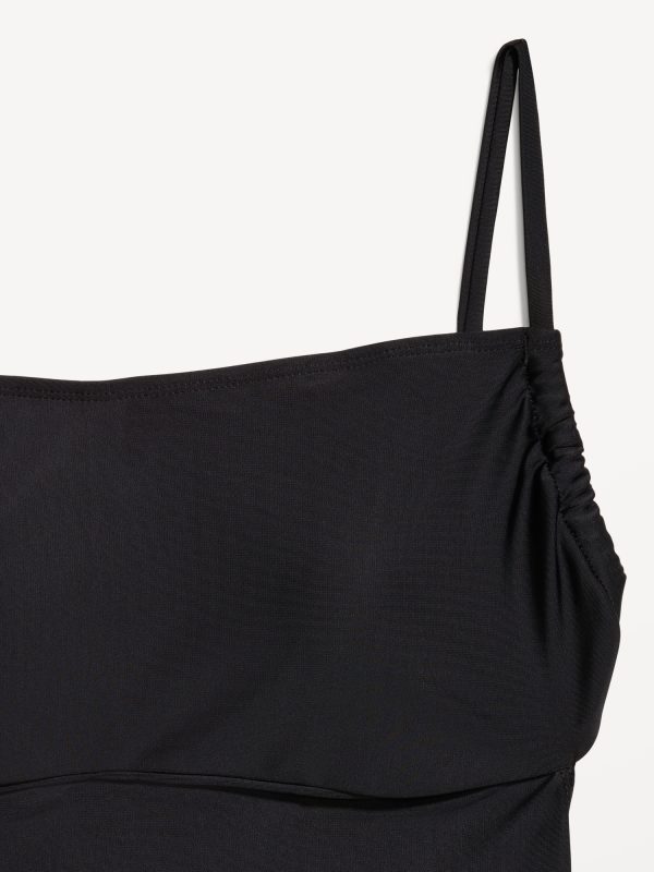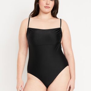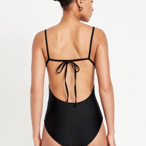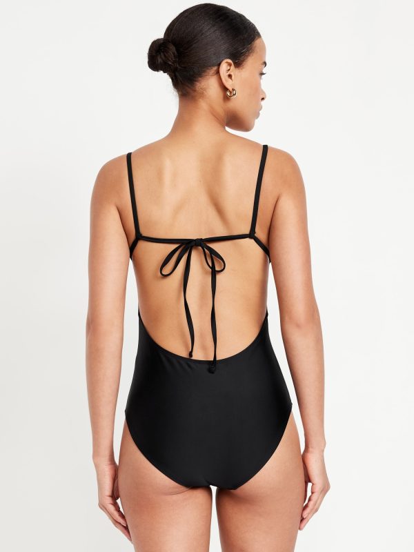 Matte Cutout Back One-Piece Swimsuit: spaghetti straps, ruched bodice, shelf bra, removable pads, cutout back, tie-back closure, elastic leg openings, #660611