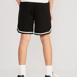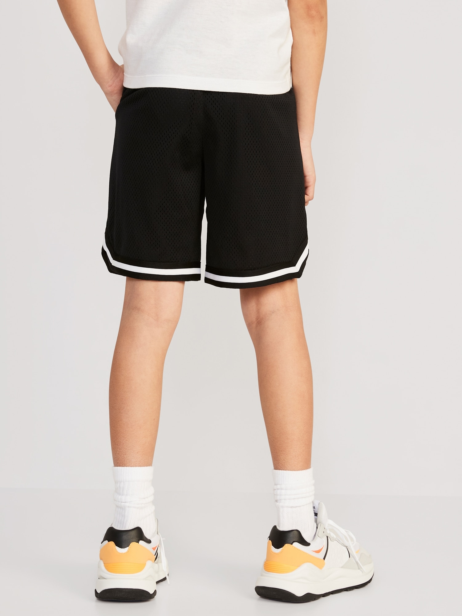 Mesh Basketball Shorts for Boys (At Knee): Made to keep up with all their shenanigans., Elasticized waistband, with adjustable drawstring., On-seam welt pockets., Retro striped tape trim at leg openings and vented sides., Breathable lightweight mesh lets him vent., Smooth, lightweight tricot lining., #875637