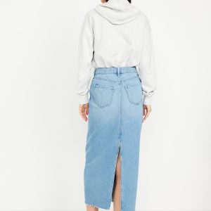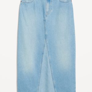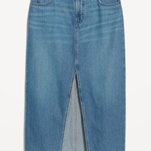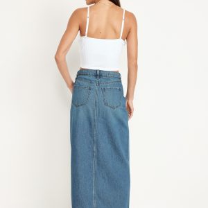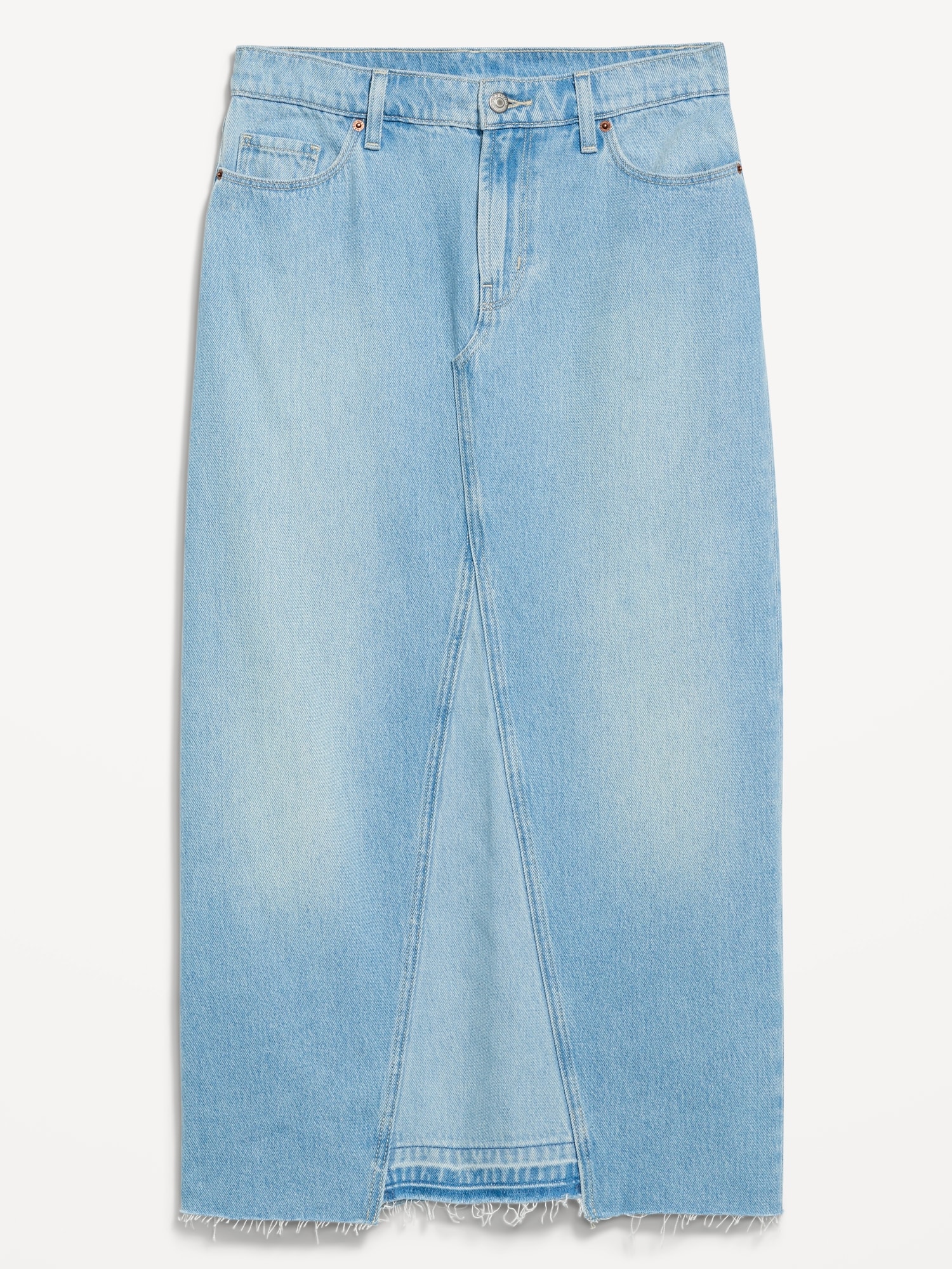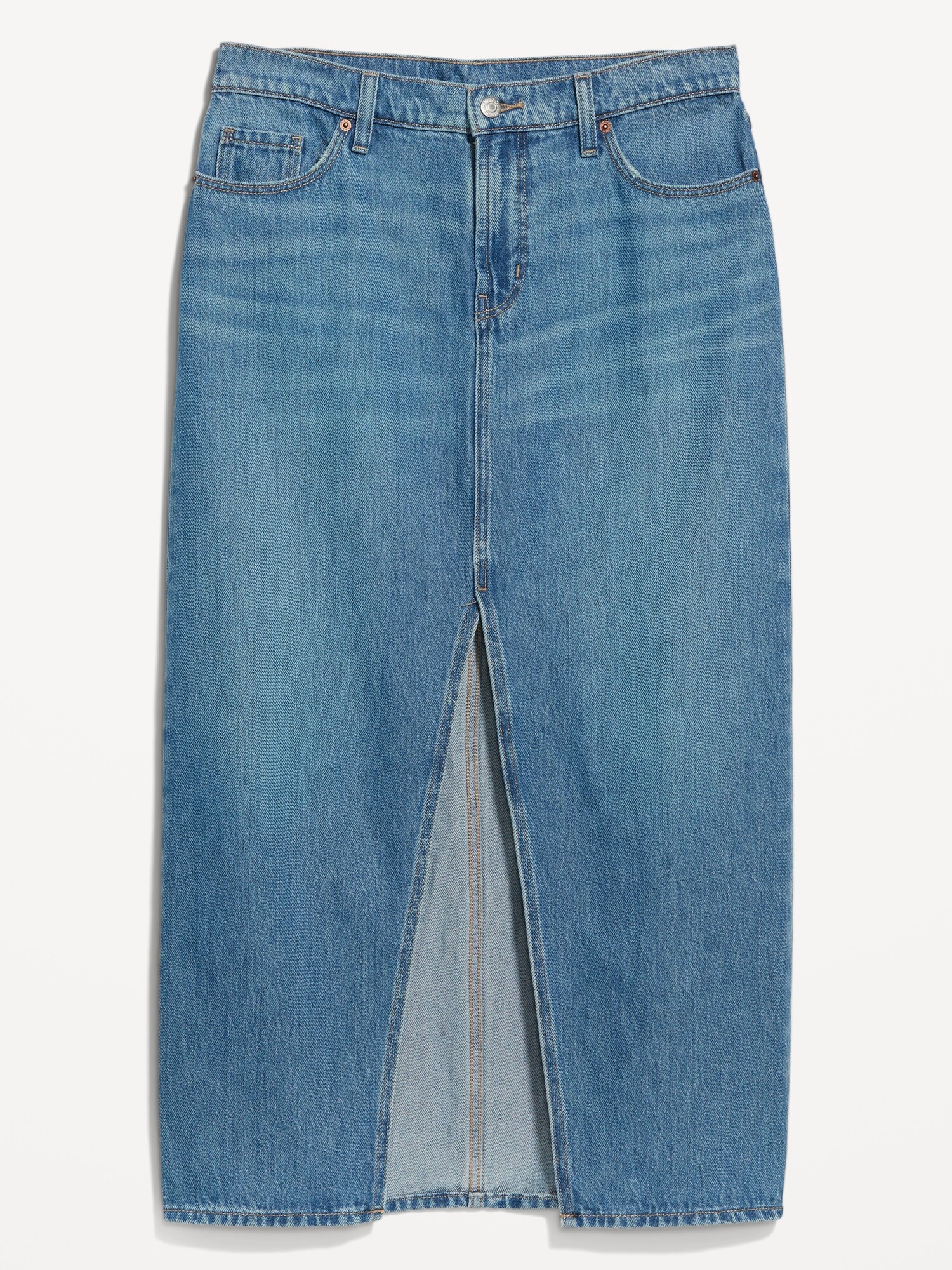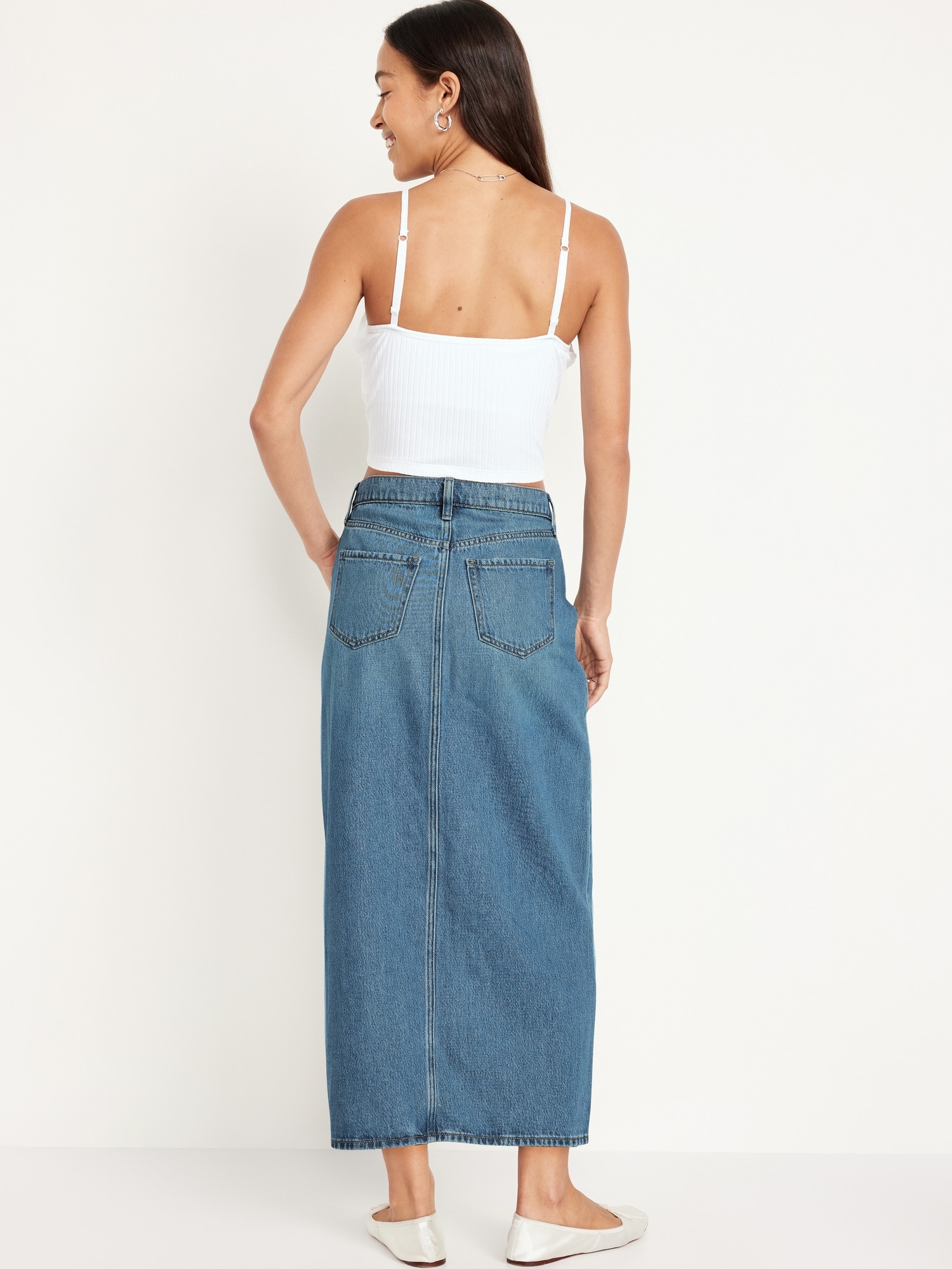 Mid-Rise Jean Maxi Skirt: zip fly, front scoop pockets, back patch pockets, front center slit, maxi length, #659674