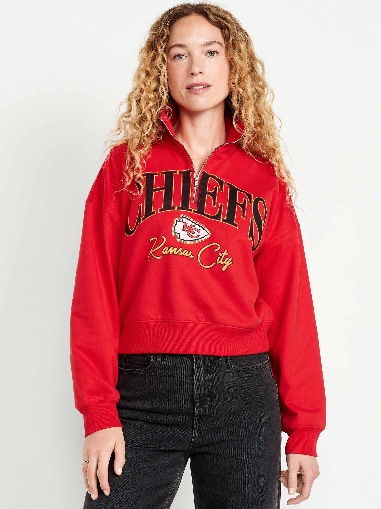 NFL™ Kansas City Chiefs™ Half-Zip Sweatshirt: mock neck, drop-shoulder sleeves, half-zip front, embroidered licensed graphic, pullover style, © 2025 NFL Enterprises LLC. NFL and the NFL shield design are registered trademarks of the National Football League., #801593