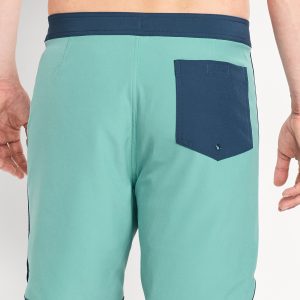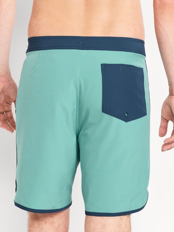 Novelty Board Shorts — 8-inch inseam: pieced elastic-drawstring waistband, secure-close fly, back right pocket with grommet drain, piping at side seams, pull-on style, #665115