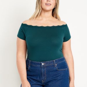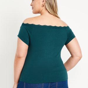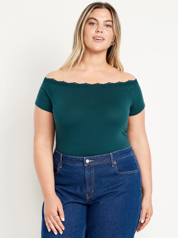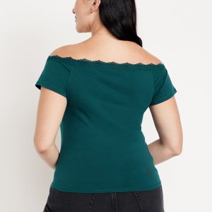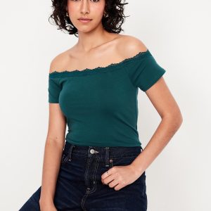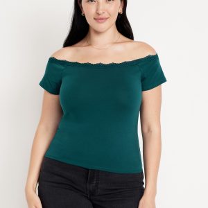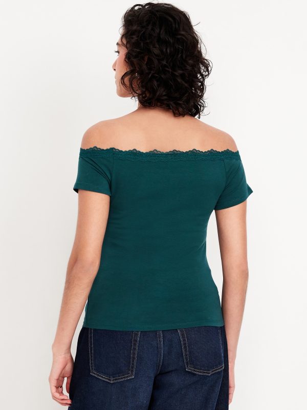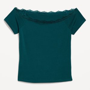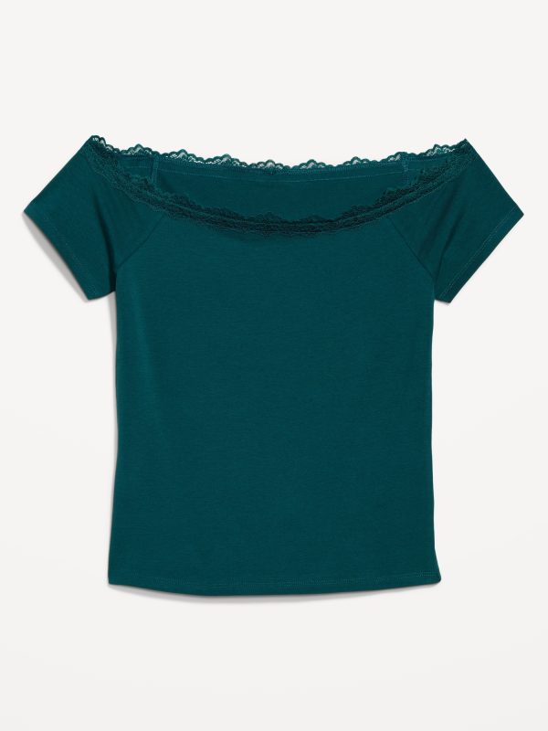 Off-Shoulder Lace-Trim Top: off-shoulder neckline, lace trim, short sleeves, #801545