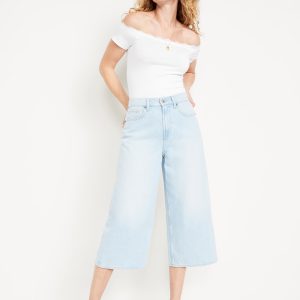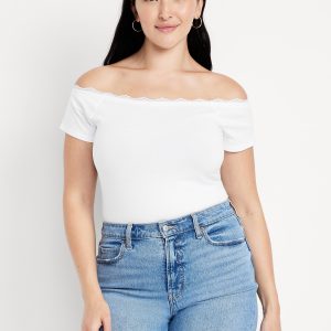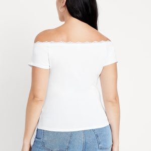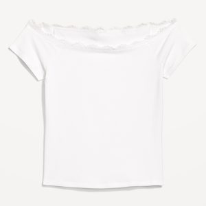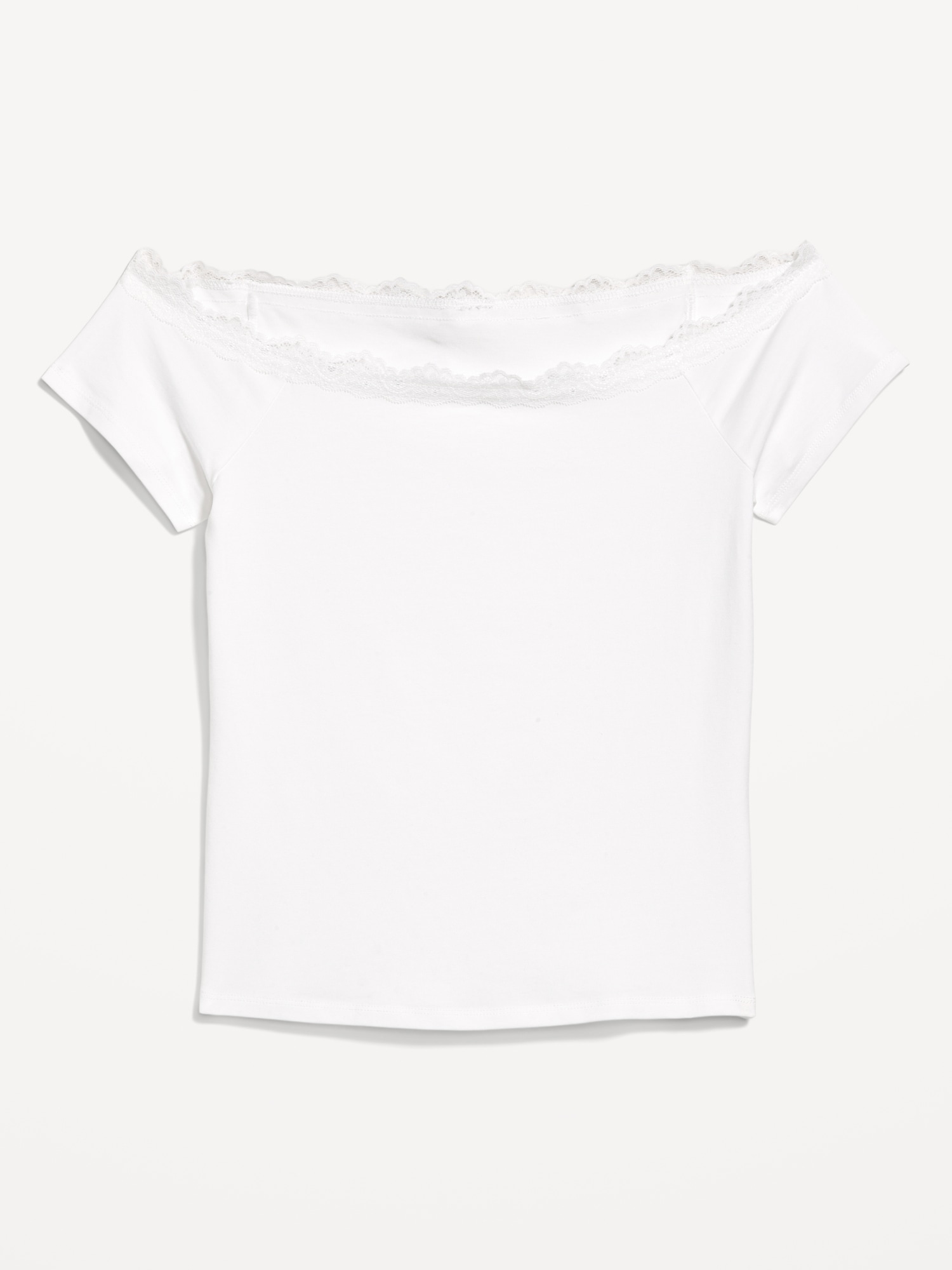 Off-Shoulder Lace-Trim Top: off-shoulder neckline, lace trim, short sleeves, #801545