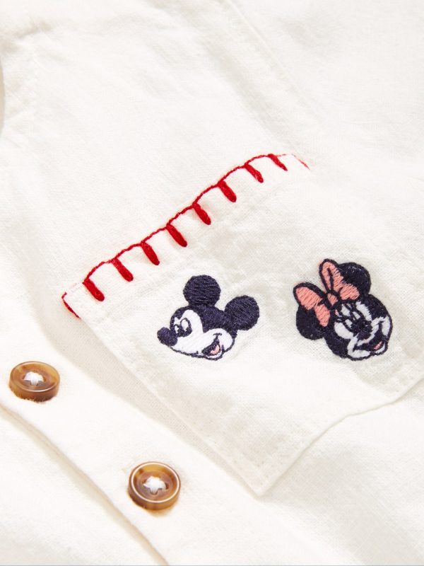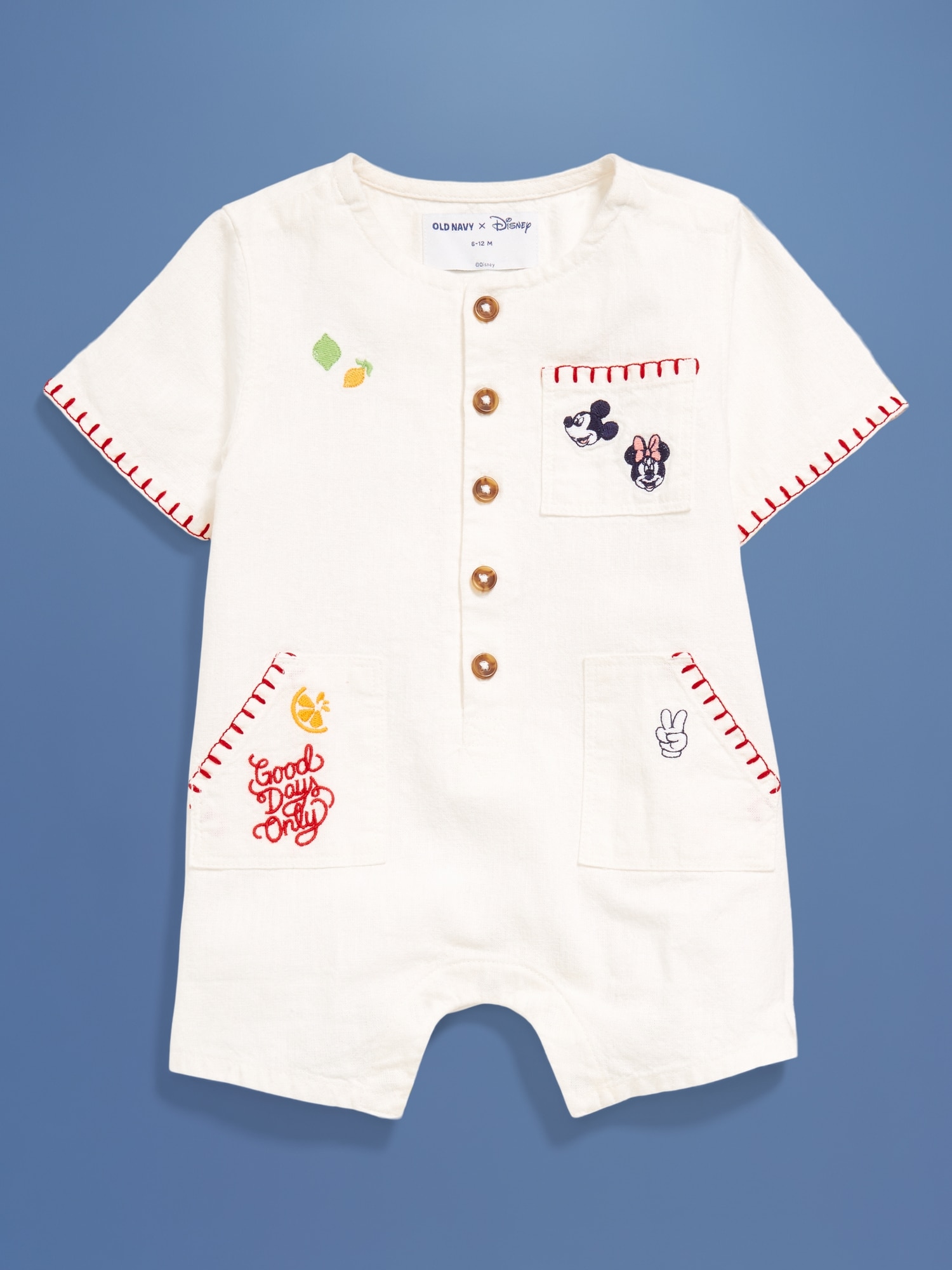 Old Navy x Disney© Embroidered Linen-Blend One-Piece Romper for Baby: Two icons, together at last. Browse the collection for the whole fam.rounded neckline, short sleeves, full length button placket, patch pocket at chest, diagonal utility pockets, hidden snaps at inseam, licensed graphic, ©Disney., #762099