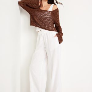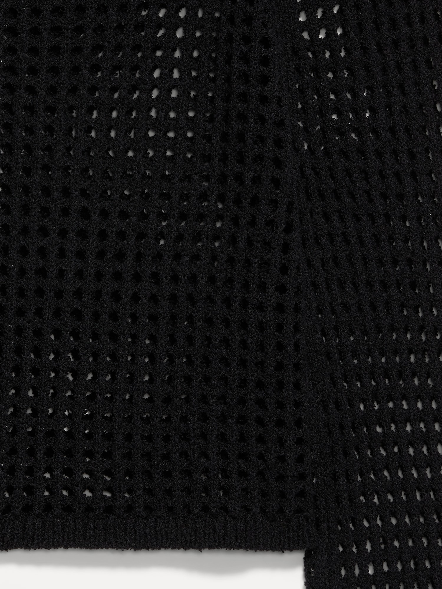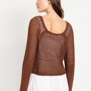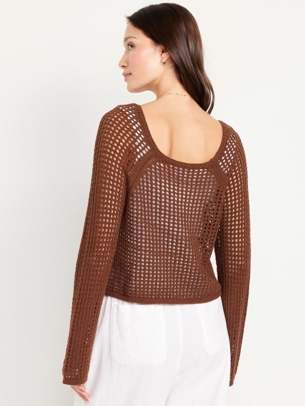Open-Stitch Cropped Bouclé Sweater: square neck, long sleeves, great for layering, #664078